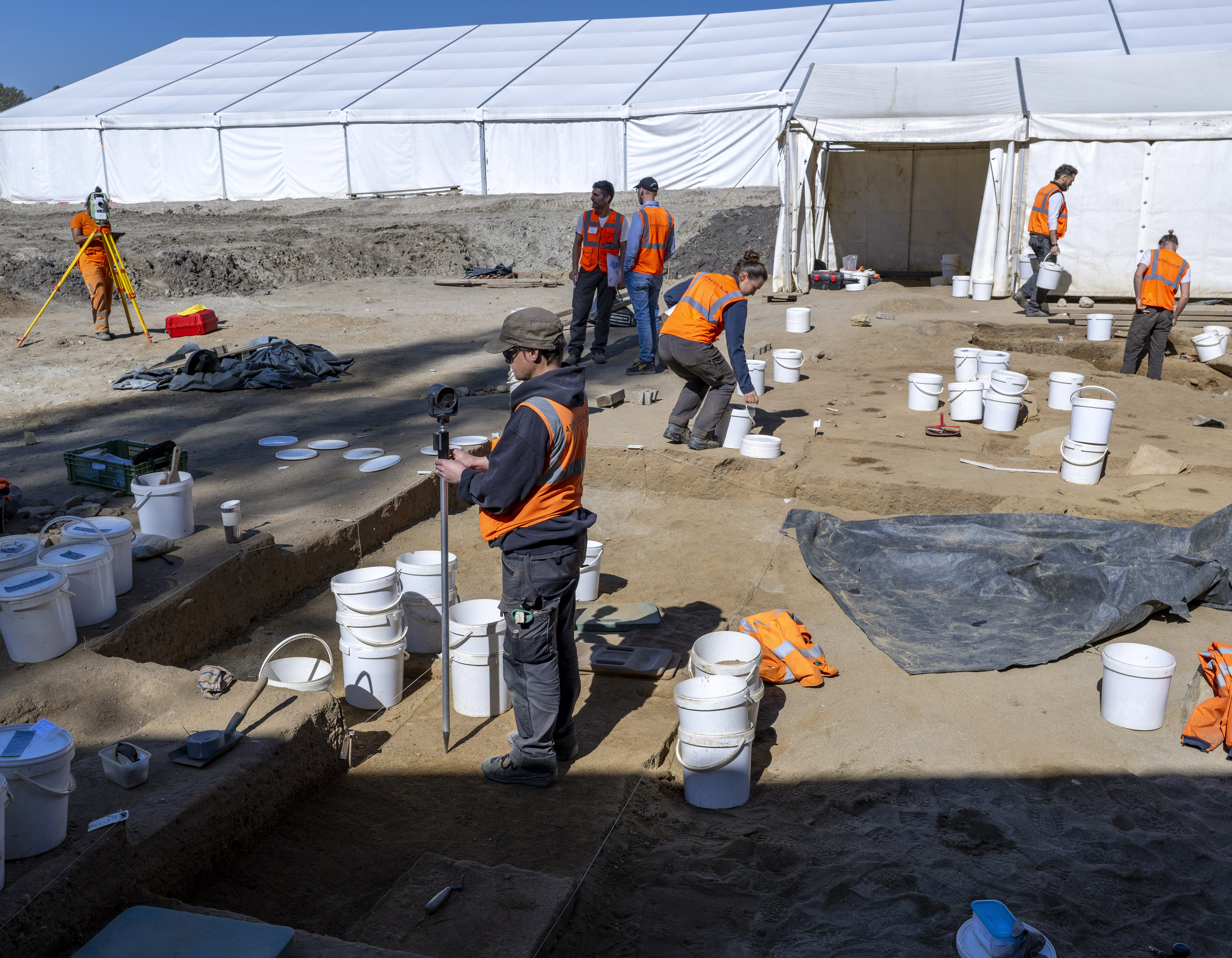Plus d'une vingtaine d'archéologues sont à l'oeuvre quotidiennement sur le terrain de Vidy la Romaine, au sud de Lausanne.