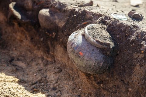 Dans les couches de terre, de 30 à 40 centimètres, des urnes en forme de vases, en céramique ou en verre, contiennent des os et des offrandes (de la nourriture ou des lampes à huile pour guider le défunt). Des corps inhumés sont aussi retrouvés avec des pièces de monnaie sur les yeux, dans la main ou la bouche pour payer le passage vers l’autre monde. «Les pratiques celtes et romaines s’entremêlent. Il y avait même un culte à Isis, déesse de la mythologie égyptienne, propre à Lousonna. On a trouvé des squelettes dans des positions très différentes, couchés sur le ventre, sur le côté et même prosternés», détaille Romain Guichon. Un peu plus loin, des squelettes de chevaux émergent. «La mise en scène des os fait penser à un contexte rituel», précise Audrey Procureur, archéologue enthousiaste, qui ne se lasse pas de ces découvertes quotidiennes.