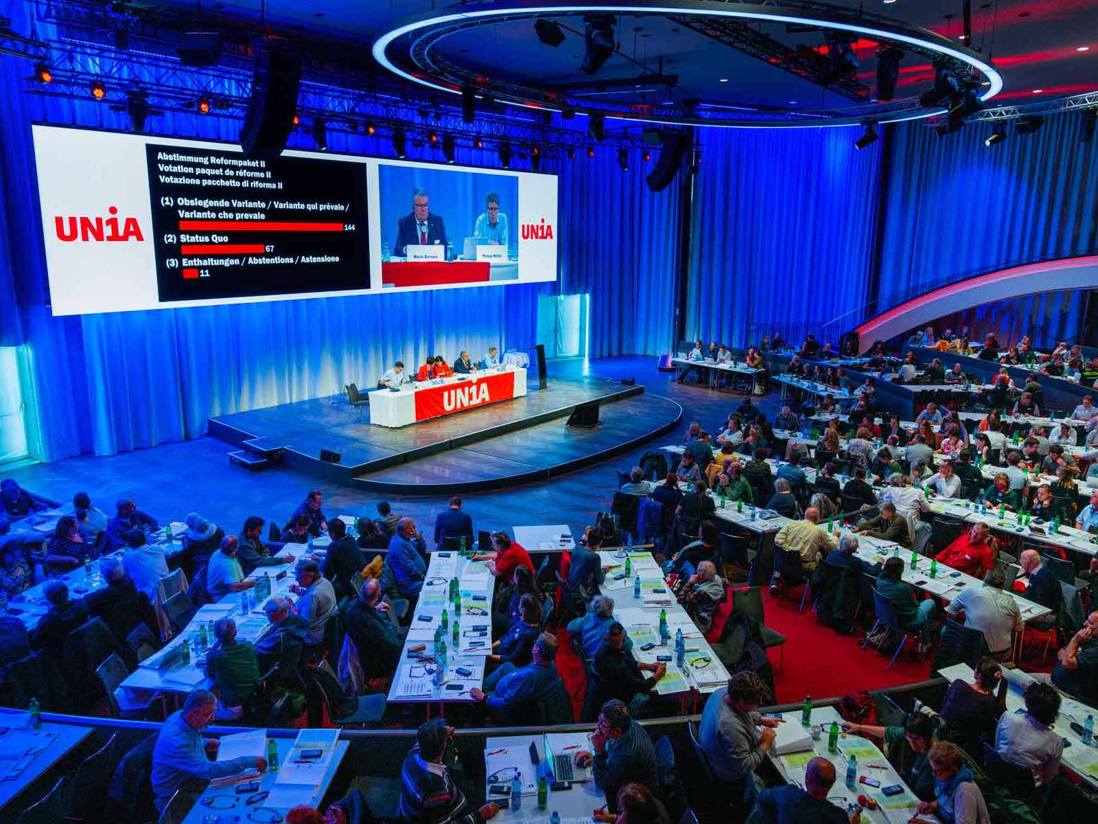 Réunis samedi dernier à Berne en Congrès extraordinaire, les délégués d’Unia se sont prononcés sur une réforme des statuts du syndicat. Ils ont également adopté des résolutions en faveur de meilleurs salaires, d’une réduction du temps de travail et pour la défense des retraites