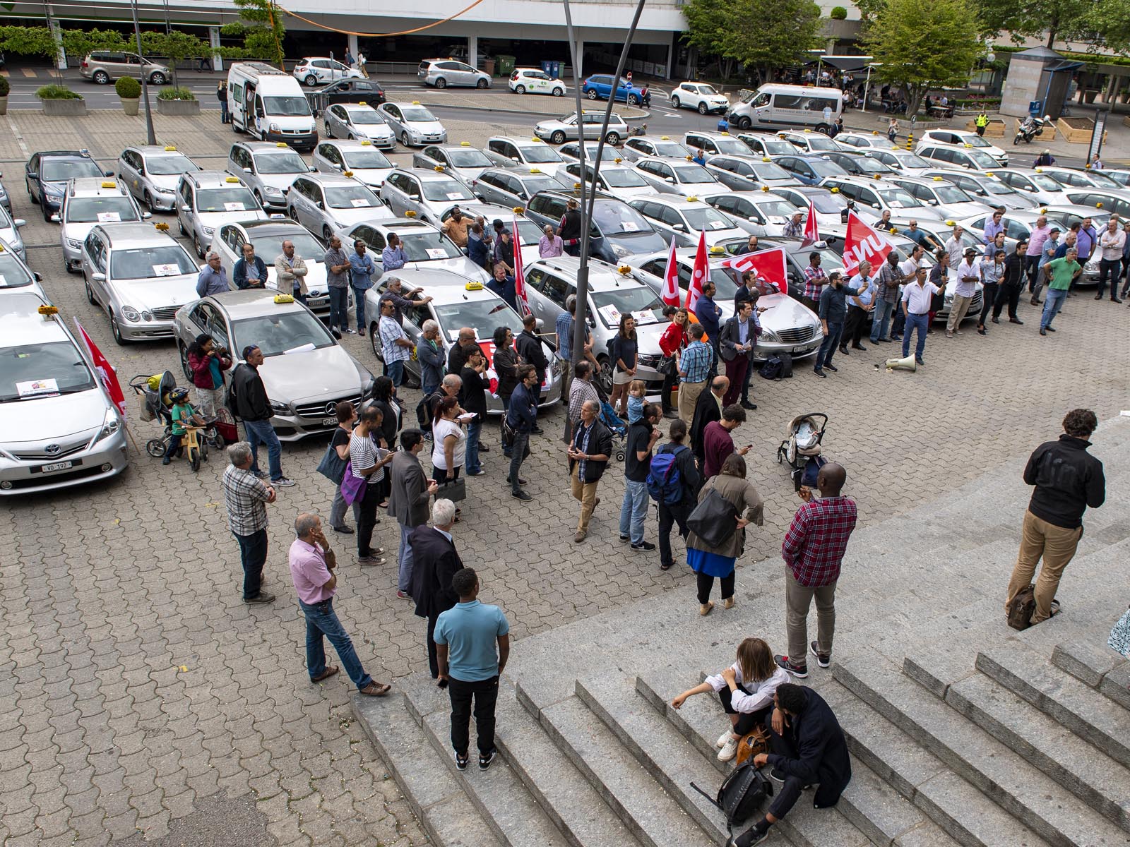 Face à la concurrence d’Uber, les chauffeurs de taxi se mobilisent, comme ici le 8 mai dernier devant le Palais de Rumine à Lausanne. Ce jour-là, les chauffeurs lausannois protestaient contre la décision du Service intercommunal des taxis de reconnaître la plateforme comme centrale d’appels.