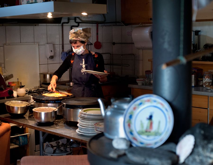 Carole Noblanc prépare des crêpes dans la cuisine du restaurant.