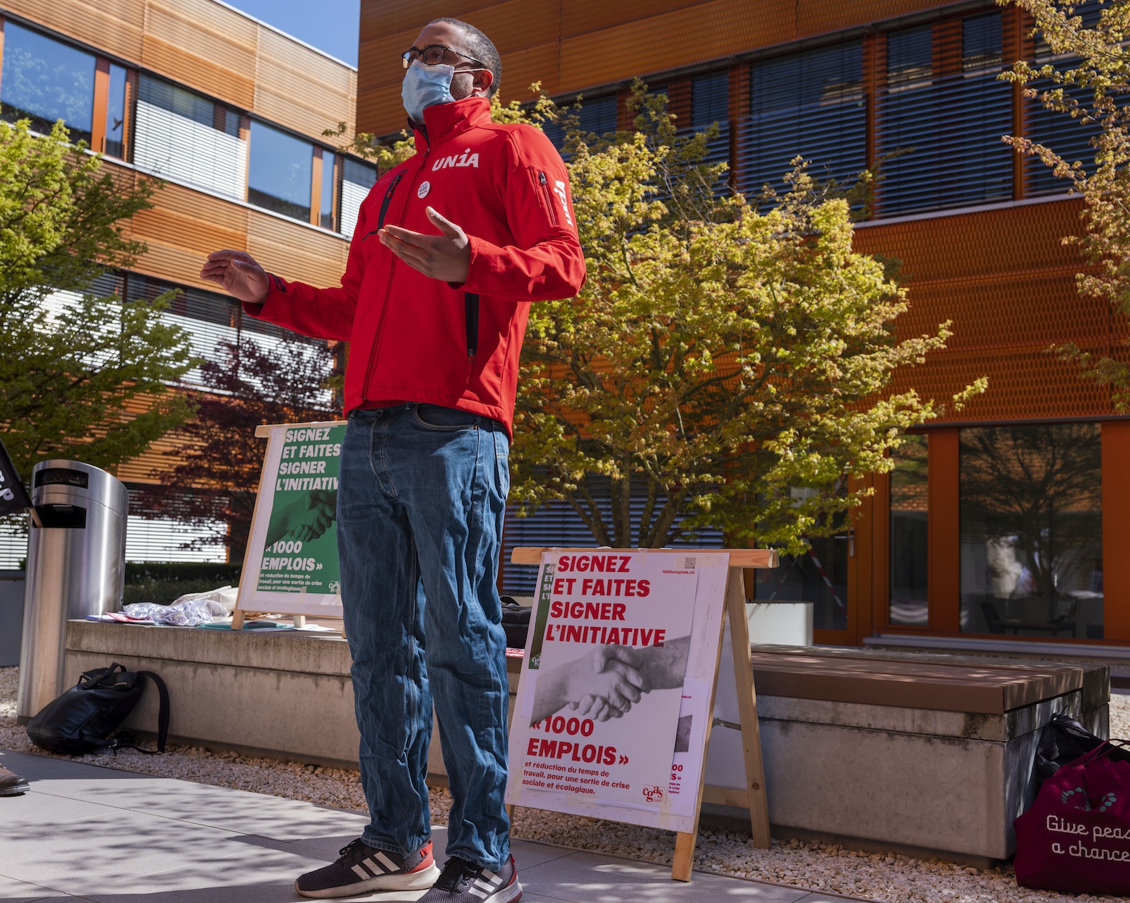 Genève affiche le taux de chômage le plus élevé du pays, 5,5% en mars, soit pas loin de 20000 chômeurs. Secrétaire syndical de Syna Genève, Komla Kpogli met toutefois en garde: «Ce chiffre ne rend pas compte des temps partiels imposés, des contrats temporaires et sur appel, ainsi que des jobs étudiants. Le nombre de demandeurs d’emploi réel se monte à 30000 personnes.» En outre, 6% de la population dépend de l’Hospice général. «Les personnes à l’aide sociale sont en augmentation constante, cette relégation est injuste et inadmissible», indique Jocelyne Haller, députée, membre de la coordination genevoise d'Avenir social, l'association suisse des travailleurs sociaux, et, par ailleurs, militante d’Unia. «L’insuffisance des mesures étatiques pour préserver les emplois fait exploser le chômage. Il est urgent aujourd’hui de lancer cette initiative», souligne Davide De Filippo.