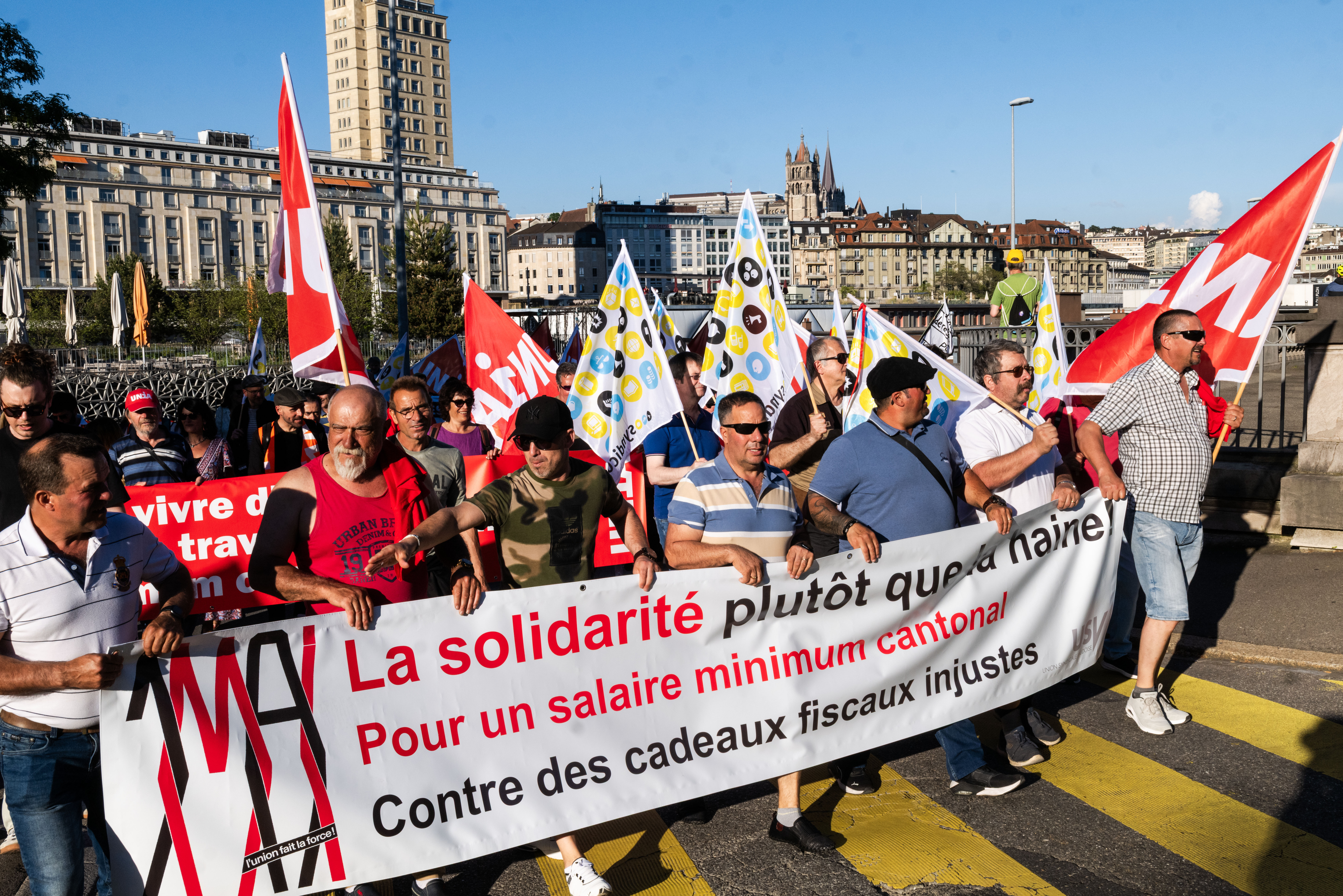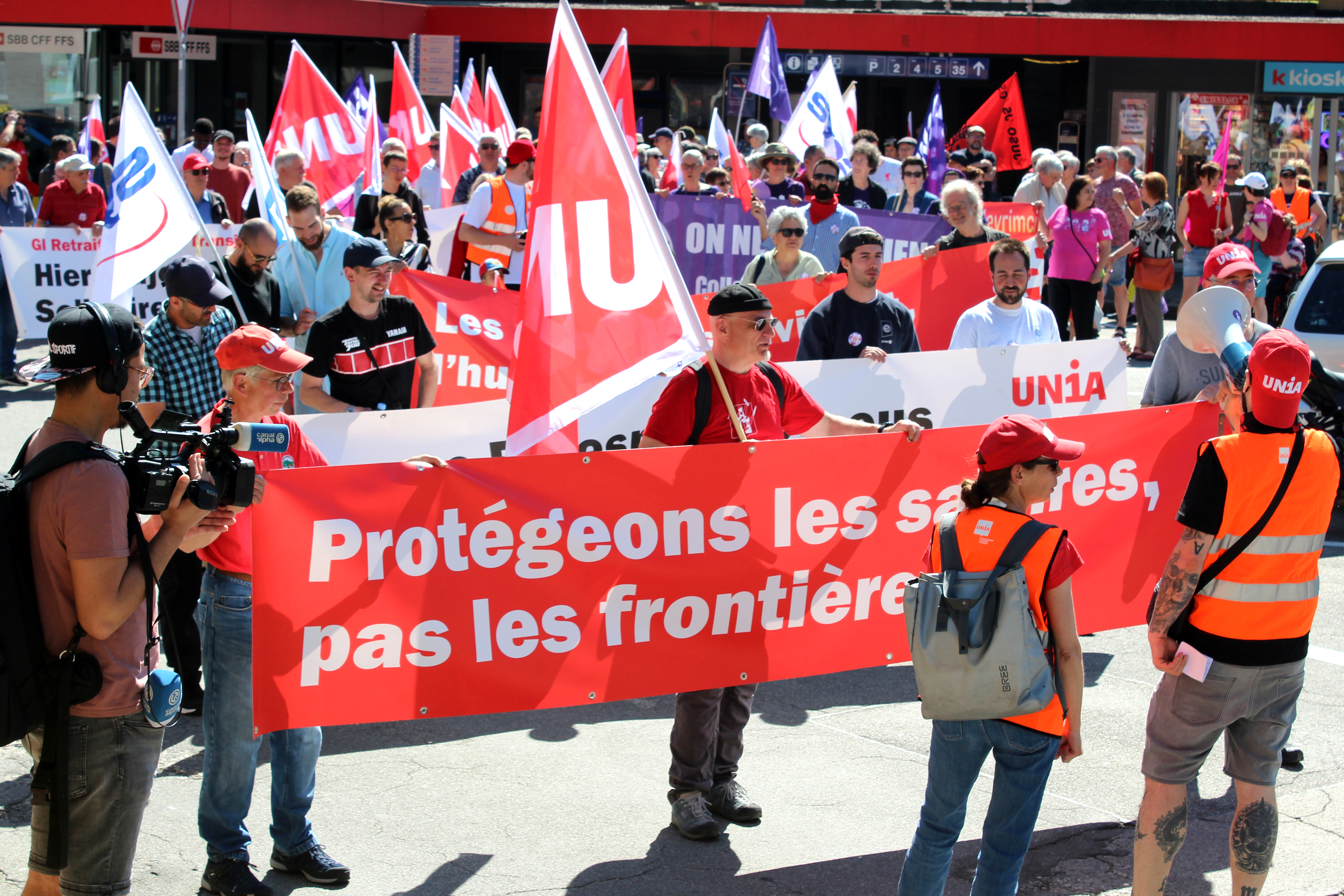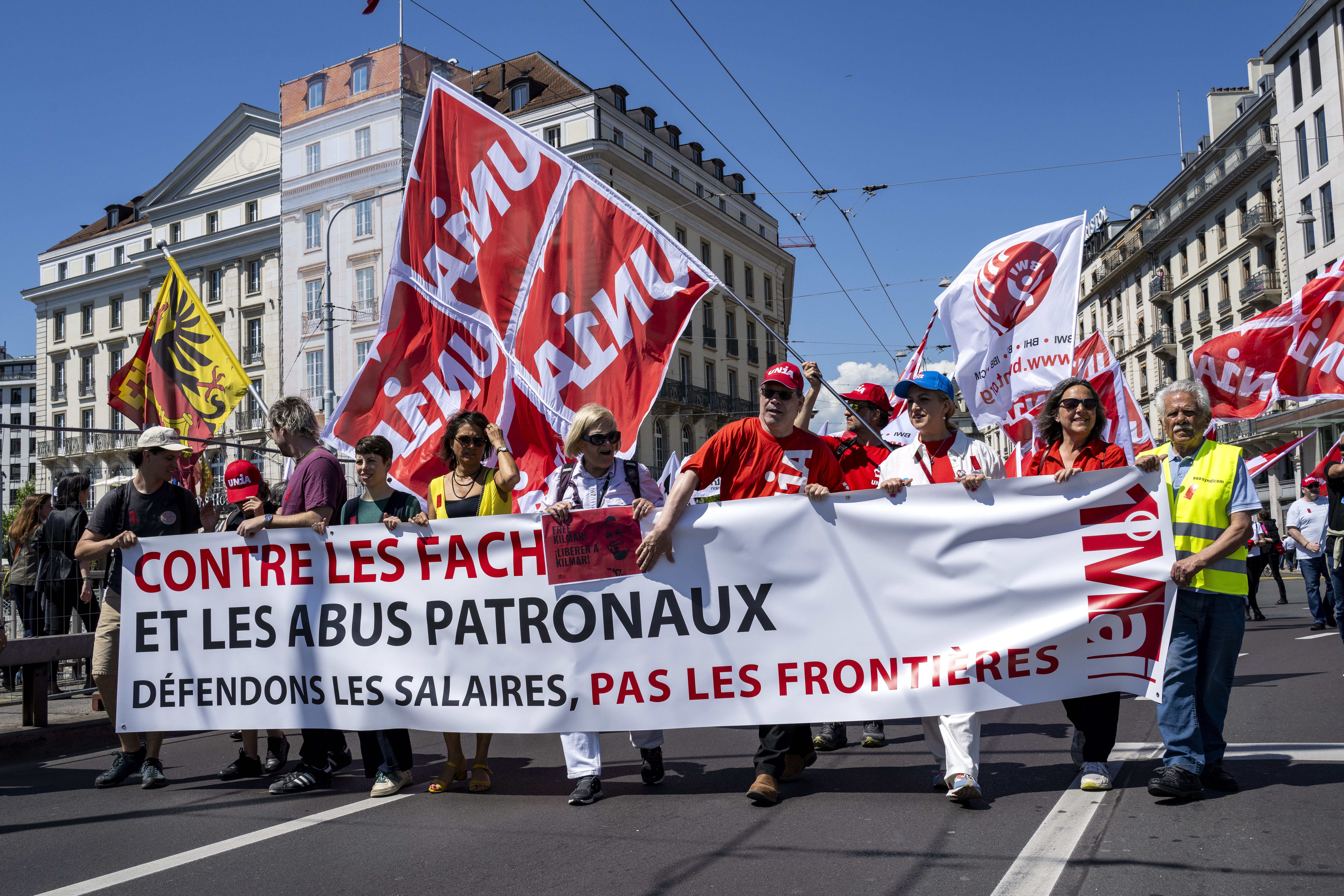 Observé avec un peu de distance, le long serpent de manifestants qui se sont donné rendez-vous à Genève avait des teintes résolument bariolées. Des causes disparates s’y sont croisées pour former une citadelle en mouvement, avec ses milliers de participants – 4000 selon le décompte des syndicats – et ses banderoles s’accrochant à de multiples revendications. La plus importante, celle qui a donné le «La» à cette Journée internationale des travailleuses et travailleurs, s’est affichée en tête de cortège, entourée par de multiples drapeaux Unia. «Contre les fachos et les abus patronaux – Défendons les salaires, pas les frontières». Un mot d’ordre tourné à la fois vers la défense des acquis et la dénonciation des dérives que connaît la planète, avec la montée décomplexée de l’idéologie d’extrême droite. En se laissant dériver dans le flux des manifestants, on y a observé aussi la présence massive d’autres syndicats et de groupes et associations plus ou moins formels. L’un soutenant la cause palestinienne et invitant au boycott d’Israël – signé Collectif Urgence Palestine – l’autre, porté par les employés de compagnies de taxi, dénonçant les transporteurs illégaux. Ailleurs encore, on pouvait lire ceci, qui a rappelé la grave crise que traverse le monde du journalisme: «La désinformation tue la démocratie, en lutte pour des médias vivants et indépendants». Unia était encore présent pour soutenir les salariés de Life Energy Motion (LEM), victimes d’un plan de restructuration dévastateur. «Licenciement en masse, 50 ans pour bâtir, 6 mois pour détruire» récitaient leurs banderoles. Et s’il avait fallu décerner un prix aux messages les plus originaux, sans doute que ceux du groupe défendant la cause LGBTQIA+ aurait remporté la mise. On mentionnera celui-ci, seul citable…: «Metro, boulot, hétéro. Bi Gouines Trans Pédales Contre le Capital».