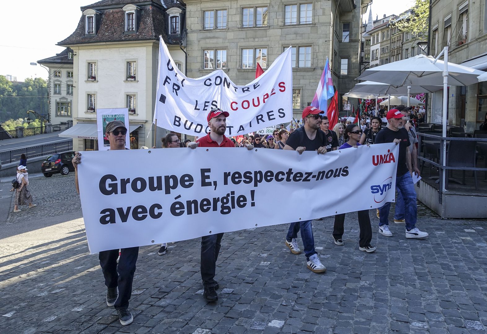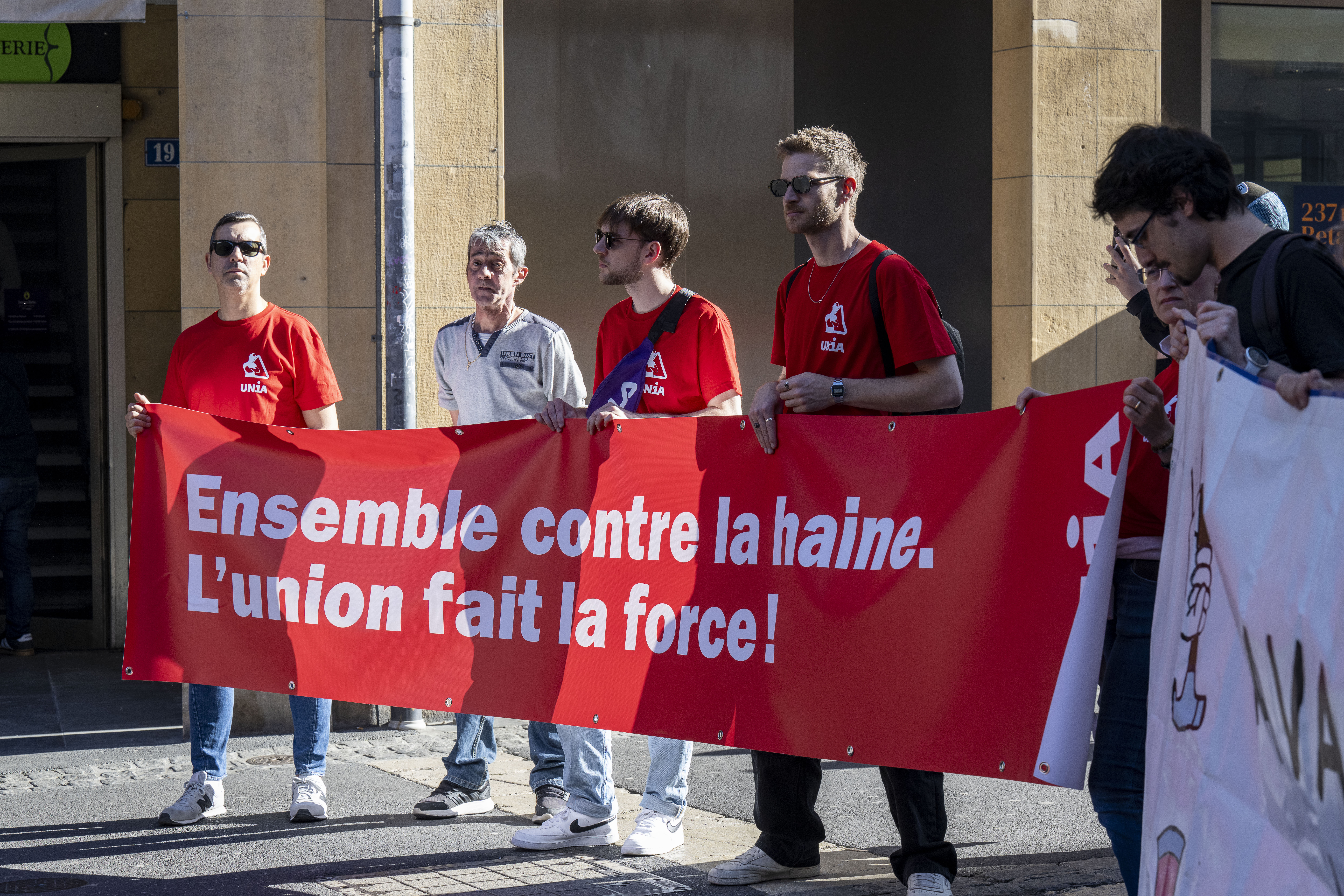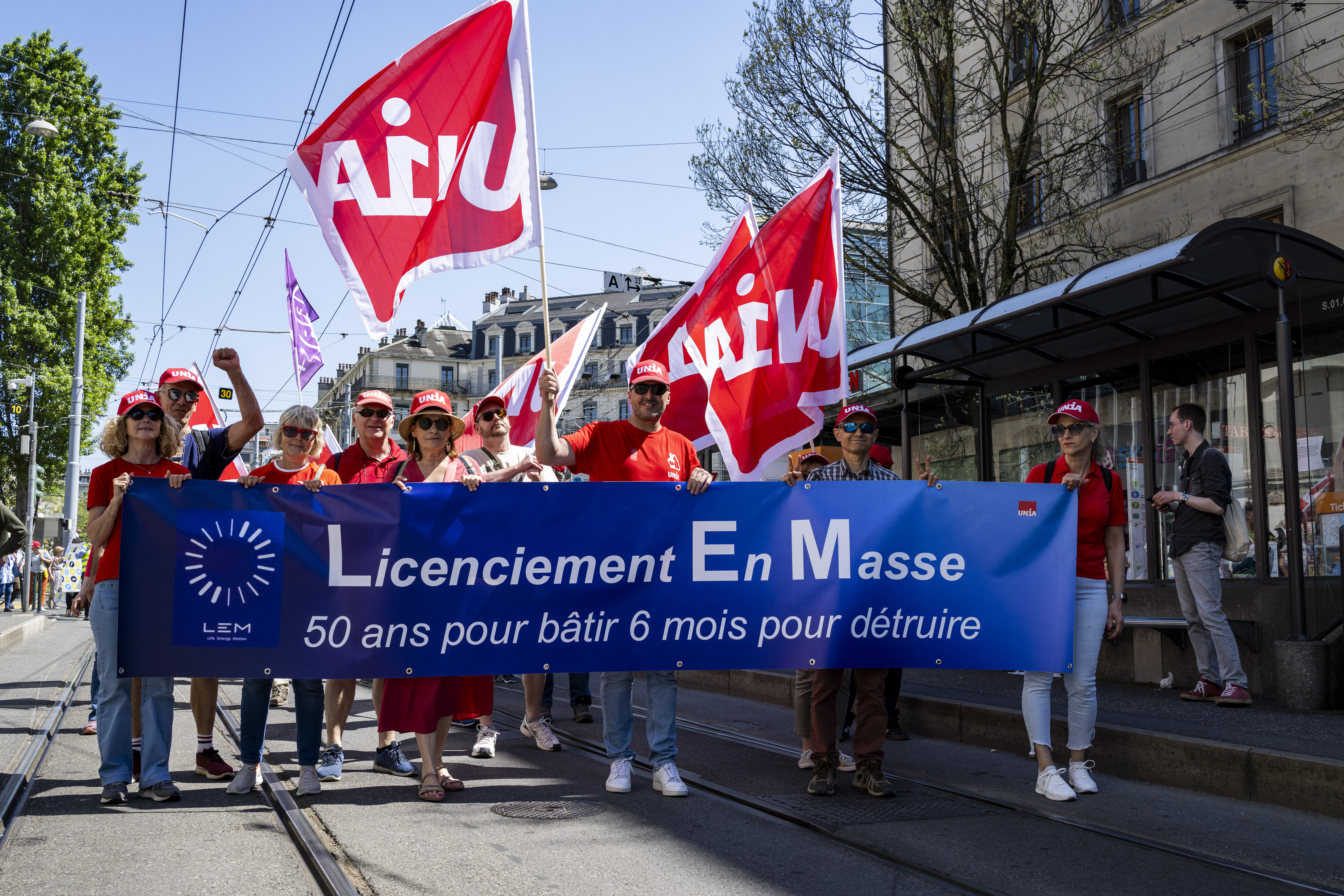 Observé avec un peu de distance, le long serpent de manifestants qui se sont donné rendez-vous à Genève avait des teintes résolument bariolées. Des causes disparates s’y sont croisées pour former une citadelle en mouvement, avec ses milliers de participants – 4000 selon le décompte des syndicats – et ses banderoles s’accrochant à de multiples revendications. La plus importante, celle qui a donné le «La» à cette Journée internationale des travailleuses et travailleurs, s’est affichée en tête de cortège, entourée par de multiples drapeaux Unia. «Contre les fachos et les abus patronaux – Défendons les salaires, pas les frontières». Un mot d’ordre tourné à la fois vers la défense des acquis et la dénonciation des dérives que connaît la planète, avec la montée décomplexée de l’idéologie d’extrême droite. En se laissant dériver dans le flux des manifestants, on y a observé aussi la présence massive d’autres syndicats et de groupes et associations plus ou moins formels. L’un soutenant la cause palestinienne et invitant au boycott d’Israël – signé Collectif Urgence Palestine – l’autre, porté par les employés de compagnies de taxi, dénonçant les transporteurs illégaux. Ailleurs encore, on pouvait lire ceci, qui a rappelé la grave crise que traverse le monde du journalisme: «La désinformation tue la démocratie, en lutte pour des médias vivants et indépendants». Unia était encore présent pour soutenir les salariés de Life Energy Motion (LEM), victimes d’un plan de restructuration dévastateur. «Licenciement en masse, 50 ans pour bâtir, 6 mois pour détruire» récitaient leurs banderoles. Et s’il avait fallu décerner un prix aux messages les plus originaux, sans doute que ceux du groupe défendant la cause LGBTQIA+ aurait remporté la mise. On mentionnera celui-ci, seul citable…: «Metro, boulot, hétéro. Bi Gouines Trans Pédales Contre le Capital».