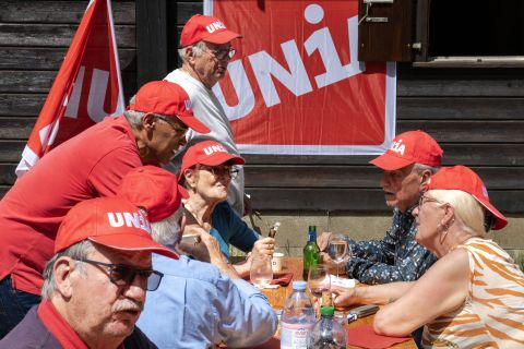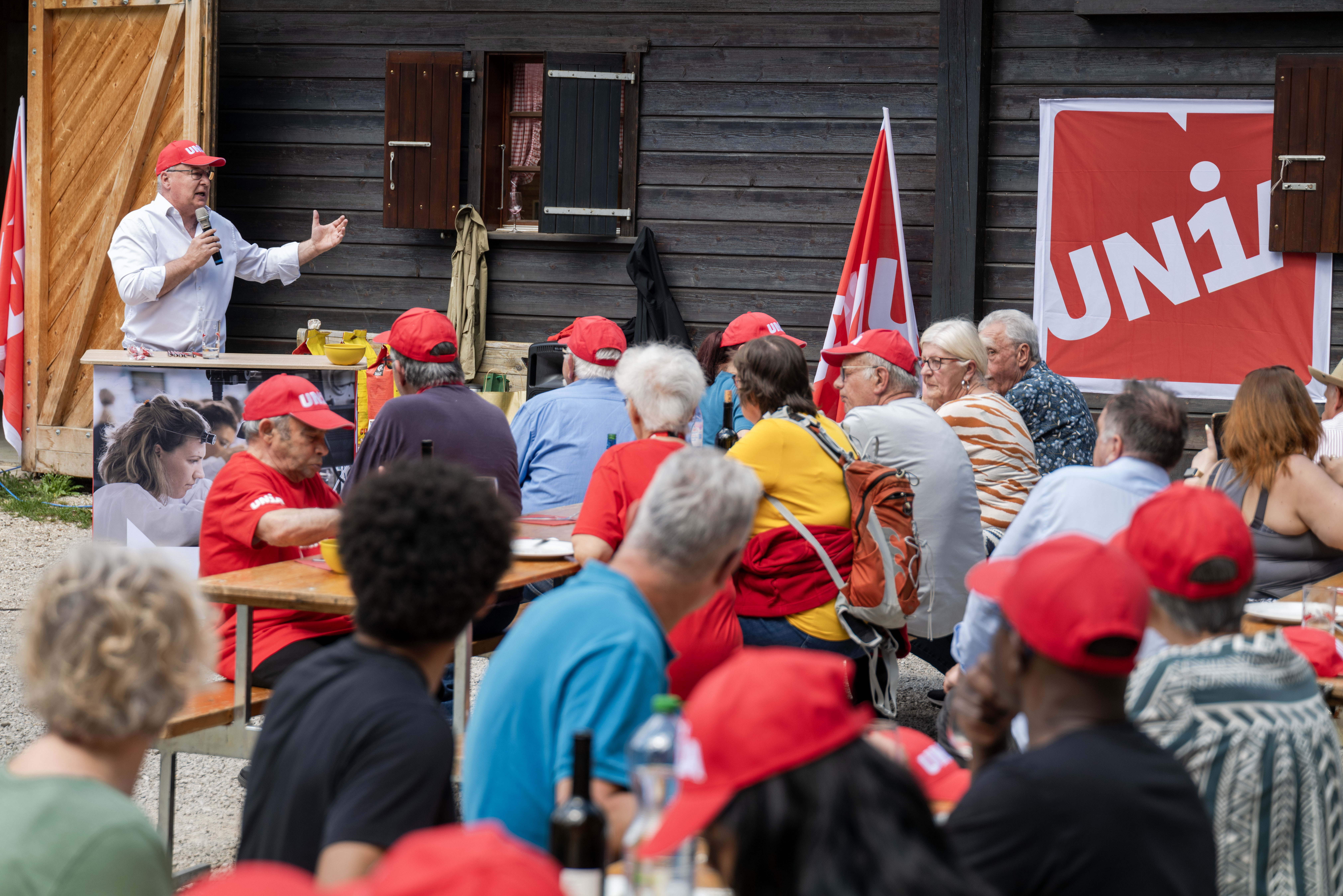 Des pâturages et un accordéon. A la Vallée de Joux, c’est dans un décor très champêtre qu’environ 200 personnes ont célébré le 1er Mai en milieu de journée, dans les environs du Sentier. Au menu de la rencontre, des discours sur la montée de l’extrême-droite dans le monde et le salaire minimum vaudois. Et, pour les papilles, des saucisses et salades offerts par la section locale d’Unia dans un refuge aux airs de guinguette. Ambiance intimiste et conviviale sous un soleil de plomb, avec Pierre-Yves Maillard, président de l’Union syndicale suisse, en guest star. Le président de l’Union syndicale suisse est venu passer un moment ici, avant de s’en aller rejoindre la Fête du travail à Saint-Gall.