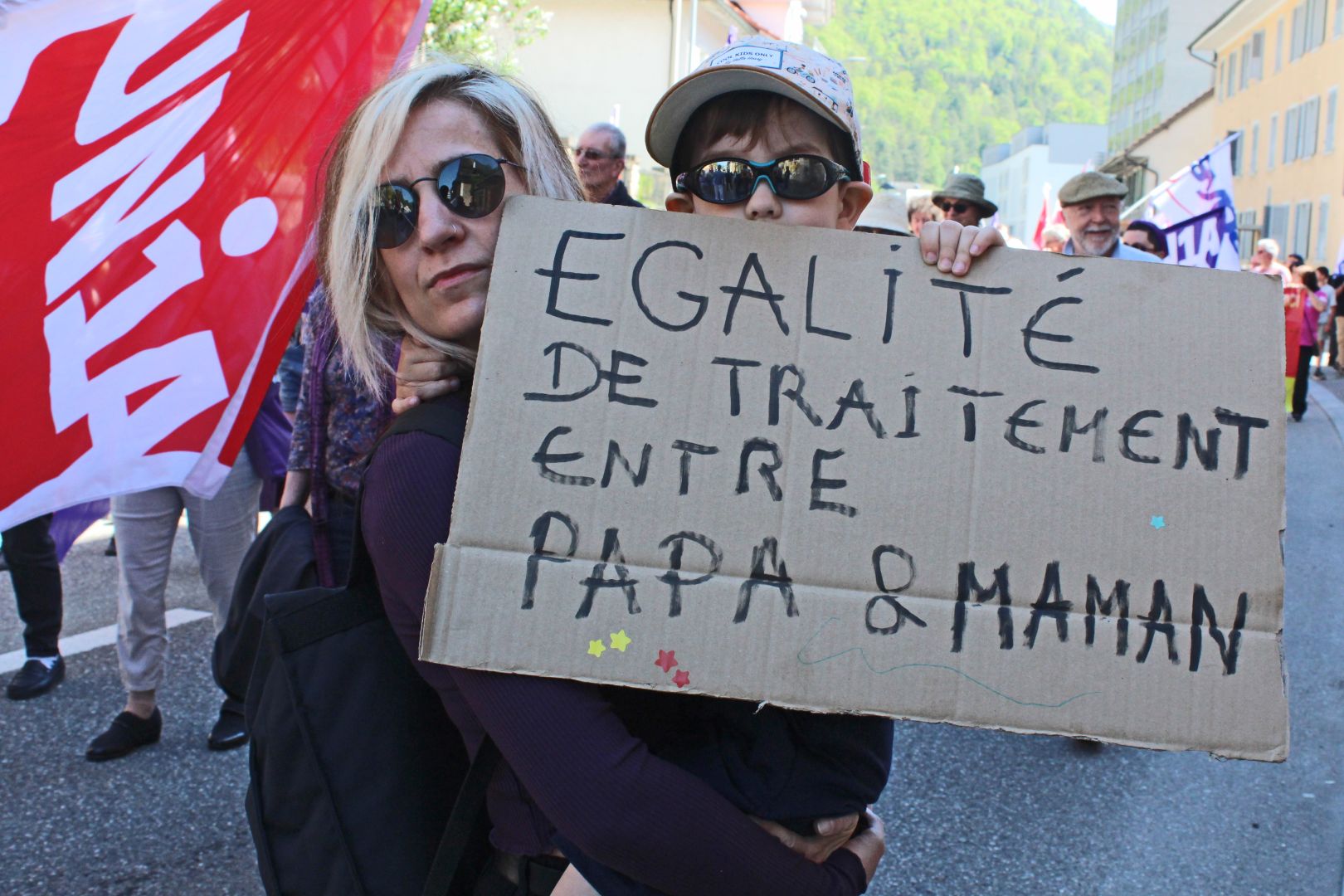 Sur la place Georges-Python, entourée de stands partisans et syndicaux, deux enfants sortent leurs trompettes perpétuant la coutume fribourgeoise du 1er Mai. Les écolières et les écoliers du canton ont en effet traditionnellement congé pour aller chanter de maison en maison. Quelques notes de musique contre quelques pièces, «pour acheter un cadeau pour la fête des Mères», soulignent les musiciens en herbe.