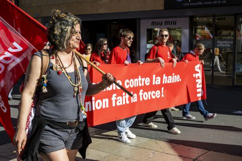 Ambiance revendicative à Lausanne qui a rassemblé plusieurs centaines de personnes défilant dans les rues de la capitale. Un cortège aux couleurs syndicales et des partis de gauche sans oublier les banderoles d’associations comme celle de Droit de rester, des Kurdes réclamant la libération Öcalan ou encore de partisans défendant la cause palestinienne. A ce propos, la vision d’une manifestante âgée particulièrement touchante, déambulant avec une canne et portant à son cou une pancarte imprimée d’un «Debout pour Gaza, arrêtez le massacre»... Amenés par une bande son fédérative entre les traditionnels airs comme Bella Ciao ou On lâche rien repris en chœur, au milieu de banderoles illustrant les requêtes des uns et des autres, les participants se sont d’abord retrouvés sur la place du Château pour écouter différents orateurs. Au cœur des discours, la nécessité de lutter contre la montée de l’extrême droite et des combats cantonaux plus ciblés comme celui en faveur de l’introduction d’un salaire minimum. A ce propos, Bounouar Benmenni, président d’Unia Vaud, a fustigé le contre-projet du Conseil d’Etat, qualifié de coquille vide avec «son record national d’exceptions». «C’est une honte, un mépris des personnes les plus modestes. Nous voulons un salaire minimum, non pas minimaliste.»