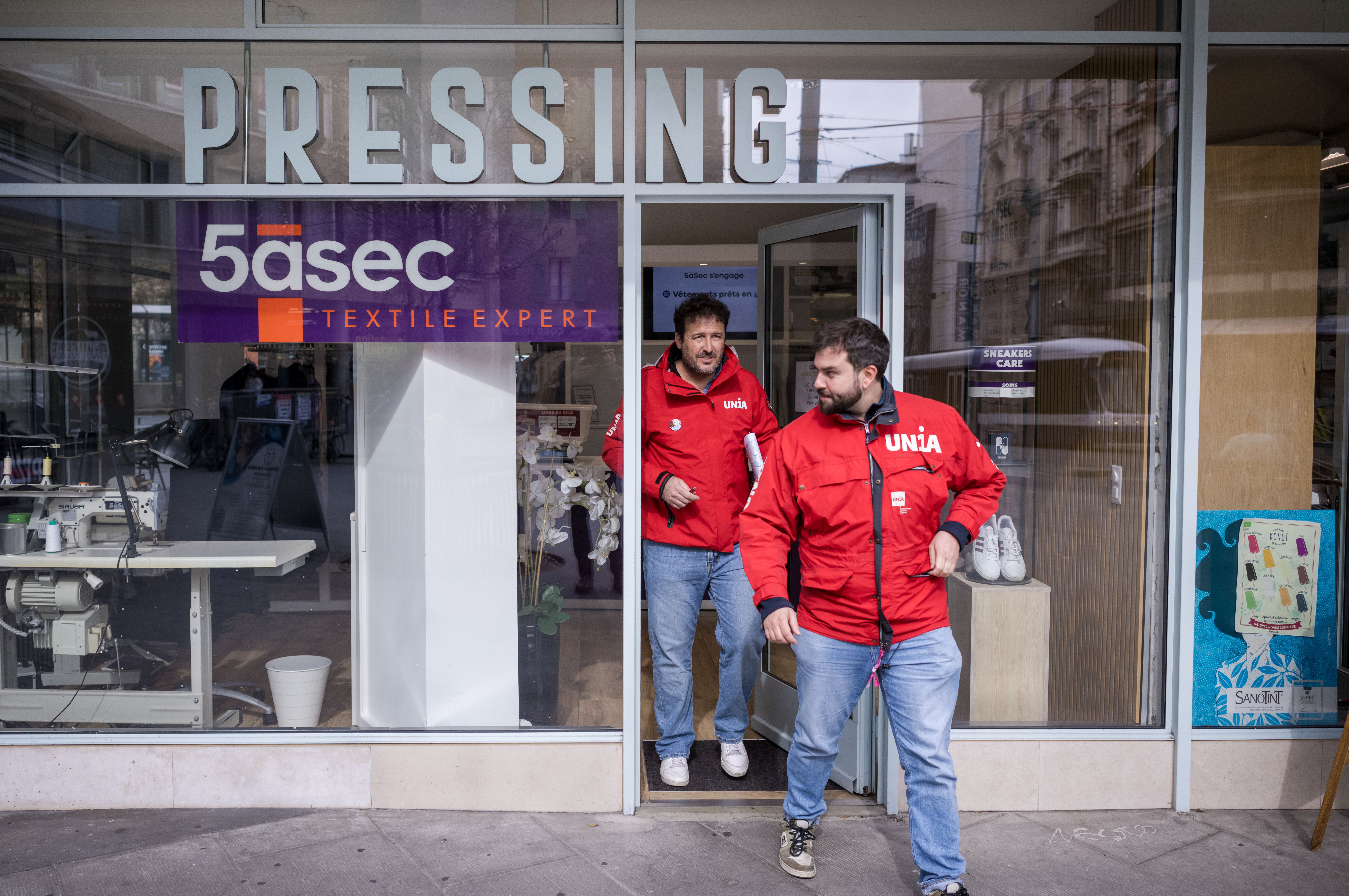Après la conférence de presse au siège genevois d’Unia, plusieurs secrétaires syndicaux ont rendu visite à toutes les filiales de 5àSec du Canton pour faire du tractage et faire signer une pétition pour la réintégration de Sandra.