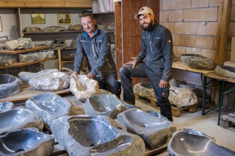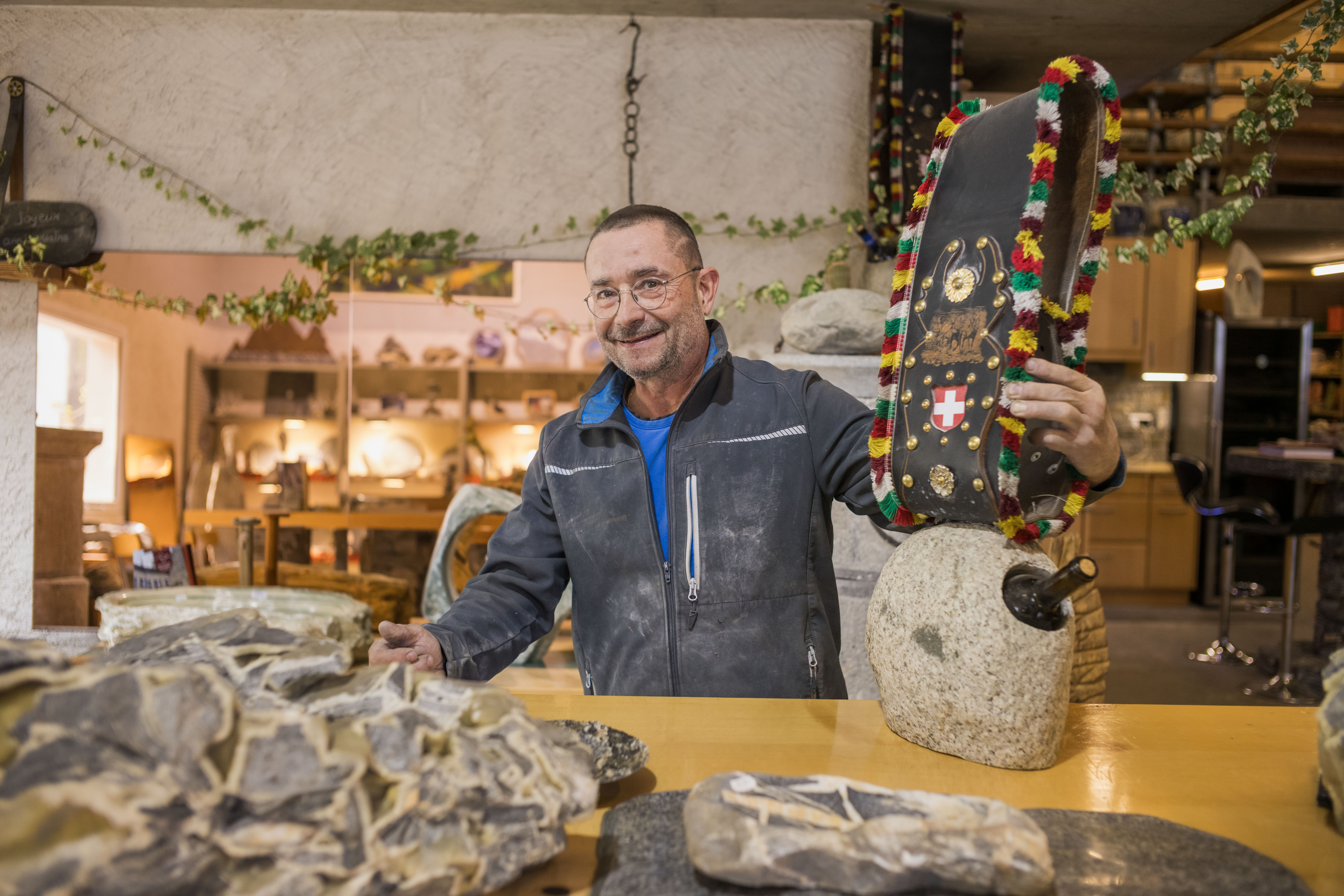 Des bacs et vases à fleurs, des rangées de vasques pour salles de bain, des assiettes et plats de différentes dimensions, des statues, des supports pour bouteilles, des couteaux, des jeux du moulin... Autant d’objets hétéroclites, la plupart utilitaires, reliés par un point commun: tous sont en pierre. Un matériau qui fascine David Sarrasin depuis l’âge de 15 ans. Dans la halle qu’il a construite avec un autre exploitant et qui lui sert d’atelier et de salle d’exposition, l’homme de 55 ans raconte: «Je rêvais de devenir cuisinier, mais mon père s’y est opposé. Il faut accepter ce que disent les parents.» Bon fils, le natif d’Orsières, en Valais, effectue alors un CFC en maçonnerie. Se passionne pour le travail. Et se lance à son compte à l’âge de 20 ans, n’entendant pas dépendre d’un patron. Durant son apprentissage, il a appris à monter des murs en pierres sèches. Une technique qu’il perpétue, comme en témoigne un bar en forme de fer à cheval et des pans de parois visibles dans le vaste espace qu’il occupe à temps partiel.