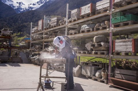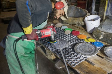 David Sarrasin détaille encore les différents gestes du métier entre carottage, découpe, bouchardage et finitions. Et note avec fierté qu’il ne possède aucune machine numérique. Travaillant actuellement à la réalisation d’une assiette, il revêt un équipement de protection, puis, une meule à disque à la main, poursuit le débitage de la pierre en transformation. Une opération qu’il réalise dans la cour extérieure jouxtant la halle où sommeillent des stocks de roches. En cette journée ensoleillée mais soumise à un foehn violent, l’homme, encerclé par les montagnes, manie avec adresse son outil. Et rabote, force à l’appui, ce petit bout d’Alpes dans un bruit infernal, produisant un épais nuage de poussière dissous par les impétueuses rafales. Son fils Brice, 27 ans, qui travaille avec lui fera une démonstration de la phase de polissage. «Pour une assiette moyenne, il faut compter quatre heures et environ six heures pour une taille standard», souligne le jeune homme, protégé par un tablier de l’eau giclant de tous côtés. «Les différentes couleurs de disques abrasifs servent à identifier la dureté des diamants. Il faut compter jusqu’à huit passages successifs en changeant de disque pour ôter l’ensemble des marques et obtenir un résultat optimal», ajoute Brice Sarrasin, partageant la passion inspirante de son père. «Il est parti de rien, il a tout construit de ses mains», note-t-il, de l’admiration dans la voix tout en continuant sa tâche.