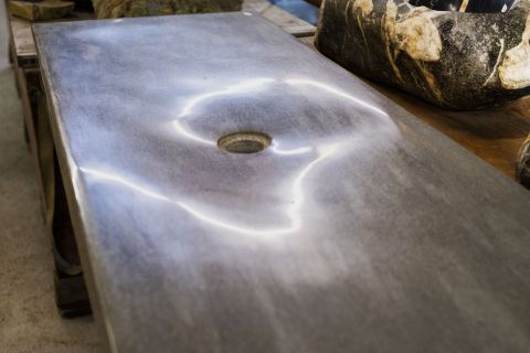 «L’été, je travaille pour mon entreprise», explique l’artisan, confiant, après des années dans la construction, avoir le corps «qui grince de partout». L’hiver, l’homme se consacre à ses créations. Des pièces qui ont toutes été réalisées avec des roches de la région prélevées dans le lit de la rivière de la Dranse et le val Ferret. Et le passionné, passant d’un objet à l’autre, de s’émerveiller constamment devant ses trouvailles, de la variété des calcaires, de leurs couleurs, des veinages, des granits du Mont-Blanc... Non sans préciser: «Ce sont les pierres qui me choisissent. Qui me parlent. Leur forme m’inspire leur devenir. La nature fait la plus grande partie du travail.» David Sarrasin va ainsi respecter leur aspect original et l’adapter à la finalité entraperçue. De la diversité à la clé, entre lavabos, cloche de vache dans lequel se glisse une bouteille, sucrier, fontaines, stèles funéraires... et même un urinoir. «Je fais de tout. J’invente chaque jour», poursuit, volubile, le manuel, qui se charge aussi de recycler des ardoises de toits de raccard en transformation pour les changer en vaisselles. Et admirant, dans ce cas encore, les veines de quartz qui font de chaque pièce un exemplaire unique.