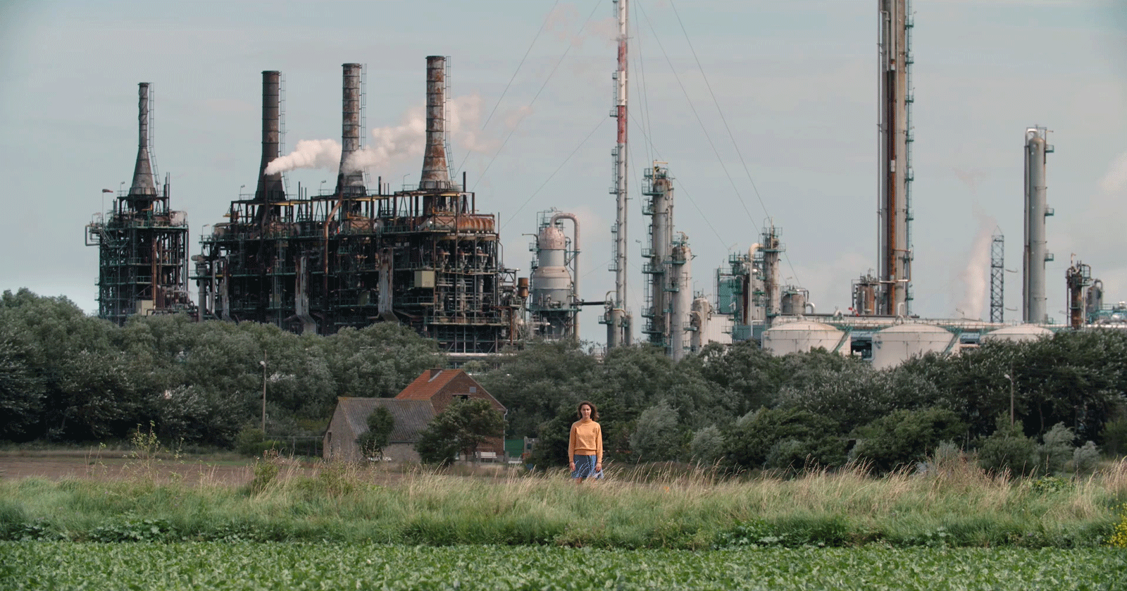 Au premier plan: une jeune fille au milieu d'un champ vert. A l'arrière-plan: une usine avec plusieurs cheminées