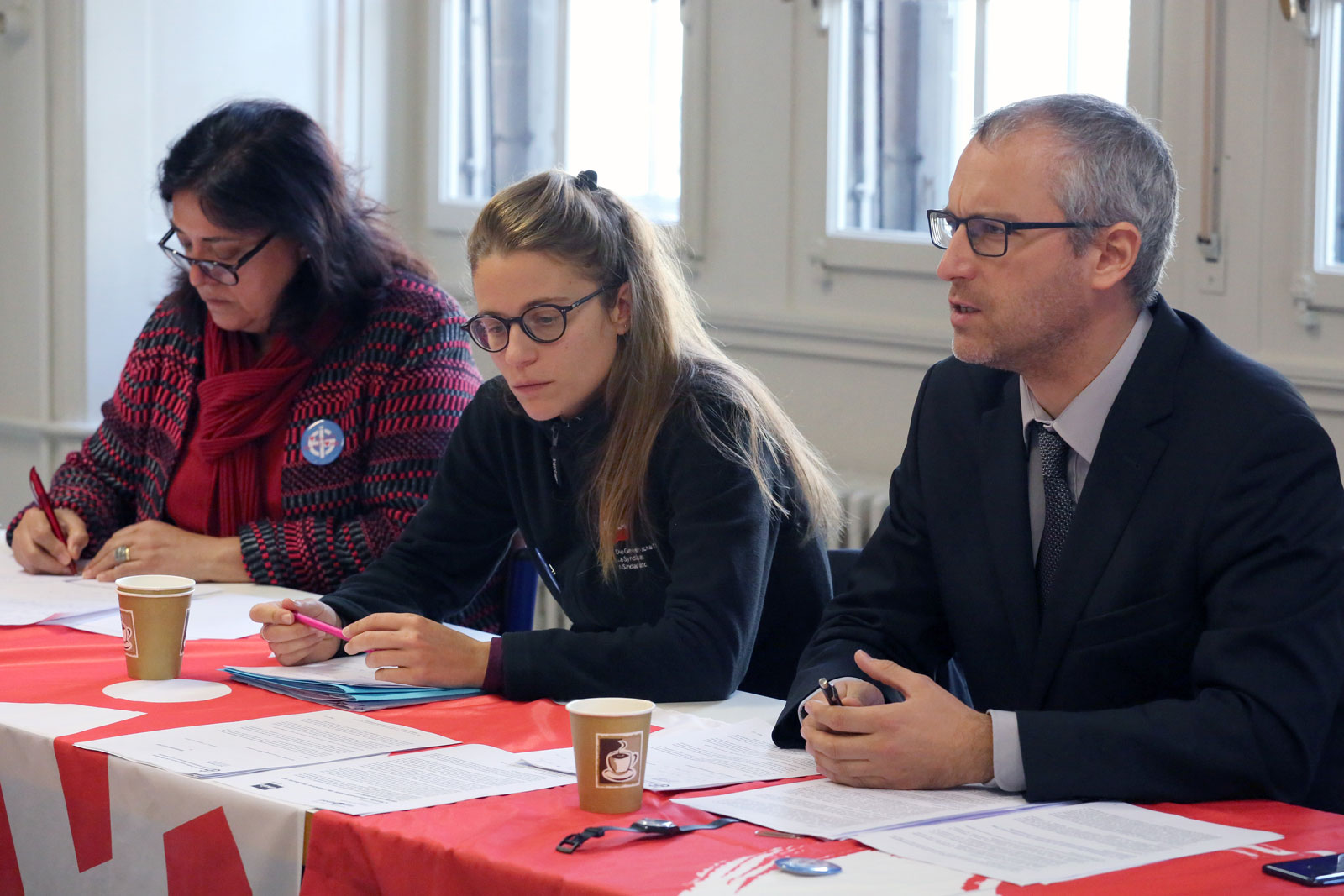 Copartenaires à la CCT de l’école, le Syndicat des services publics et Unia se mobilisent pour la réintégration du délégué syndical licencié arbitrairement. Margarita Castro du SSP, à gauche, et Giulia Willig, au centre, étaient accompagnées par l’avocat Christian Dandrès lors de la conférence de presse.