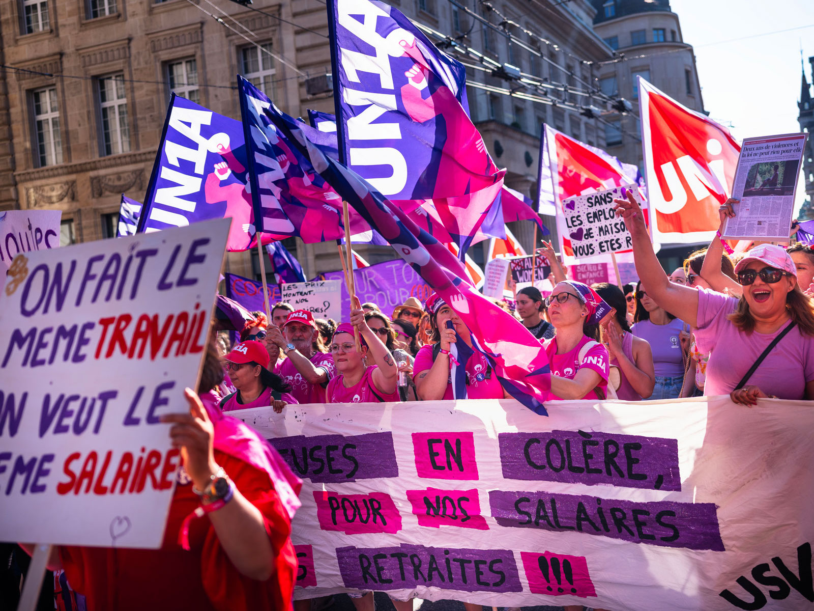 Grèves, pauses de protestation, défilés: plus de 300000 personnes ont participé à la Grève féministe du 14 juin. Une journée écrite à l’encre violette qui s’est invitée dans plusieurs entreprises et dans l’espace public. Au nom d’une égalité qui n’est toujours pas réalisée. Afin de réclamer du temps, du respect, de l’argent, mot d’ordre des travailleuses luttant, avec le soutien d’Unia, pour des rémunérations et des rentes suffisantes pour vivre, des horaires de travail équitables, la fin des discriminations et du harcèlement sexuel. En plus des manifestations et des cortèges traditionnels, différentes actions et rassemblements sur les lieux de travail ont ainsi été mis sur pied. En Suisse romande, des mobilisations se sont déroulées dans le secteur de l’industrie horlogère: des ouvrières se sont réunies dans les cantons de Genève, Vaud et Neuchâtel afin de dénoncer les différences salariales avec leurs homologues masculins et d’exiger une meilleure protection contre la violence sexualisée. A Lausanne et dans la ville du bout du lac, des vendeuses ont organisé des actions pour protester contre les bas salaires dans la branche, le temps partiel contraint ou encore la difficulté de concilier la vie professionnelle et la vie familiale. Dans le canton de Vaud, des assistantes en pharmacie ont, elles aussi, dénoncé des rémunérations bien en dessous des compétences et des responsabilités nécessaires à l’exercice de leur métier et exigé la signature d’une convention collective de travail. A Fribourg, les employées d’une blanchisserie se sont réunies à midi pour une pause prolongée... Quelques exemples de luttes dont plusieurs sont relatées au fil des pages de cette édition spéciale pour une journée extraordinaire, portées par des femmes combattives, fortes et fières.