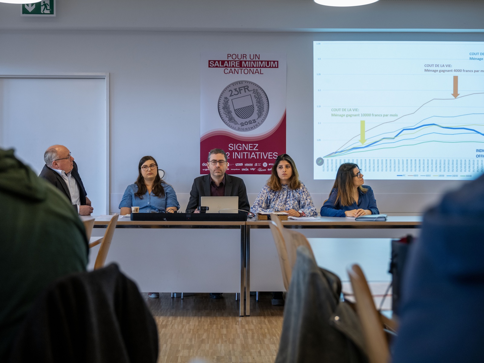 A la Maison du peuple à Lausanne, le 12 mai, Pierre-Yves Maillard, Rebecca Joly, Arnaud Bouverat, Gabriela Lima et Elizabete Cunha, ont représenté les syndicats et les partis de gauche, membres du comité unitaire, afin de lancer deux initiatives populaires, l’une constitutionnelle et l’autre législative, pour l’instauration d’un salaire minimum.