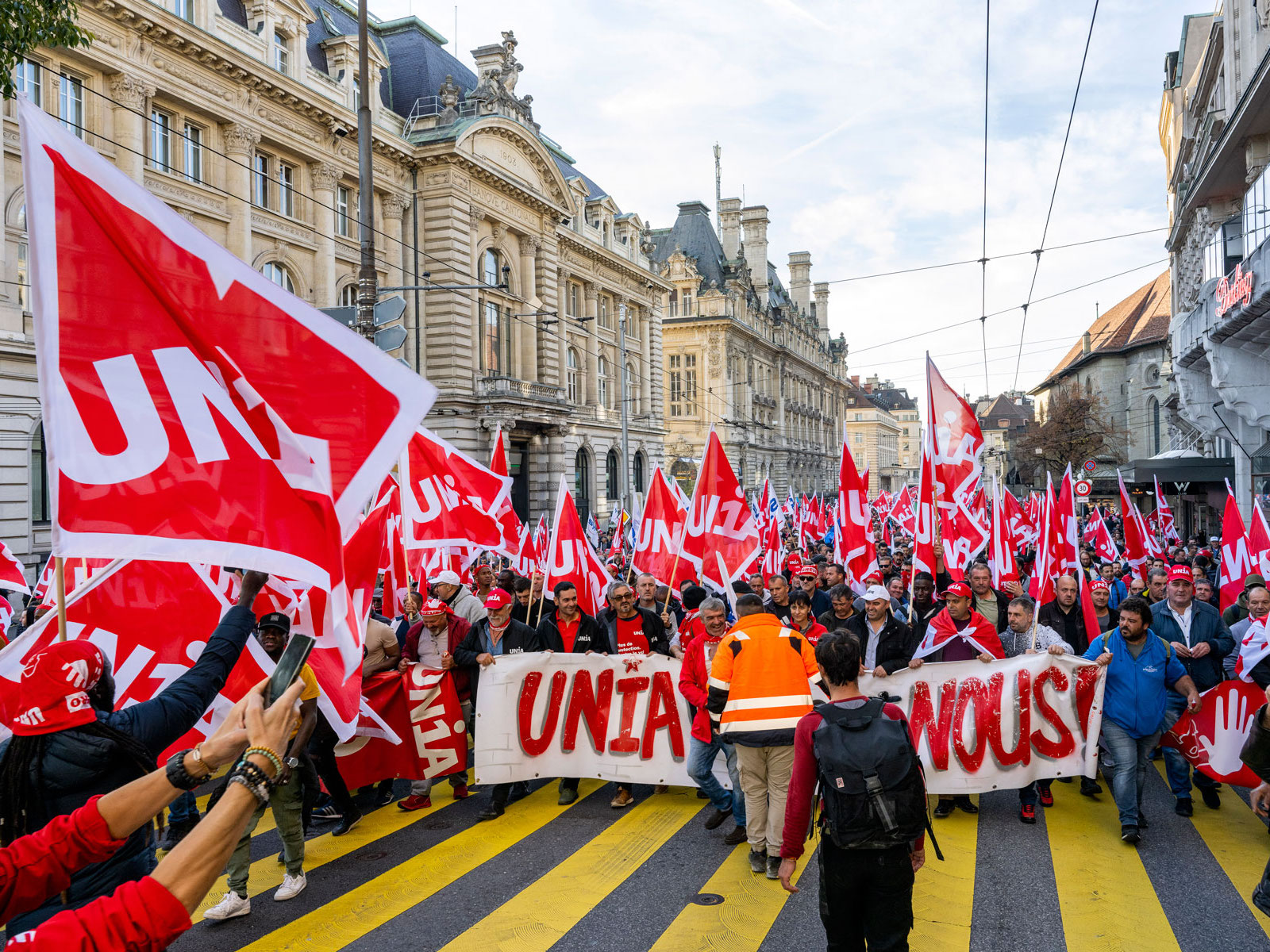 Manifestants à Genève avec des banderoles et des drapeaux Unia.