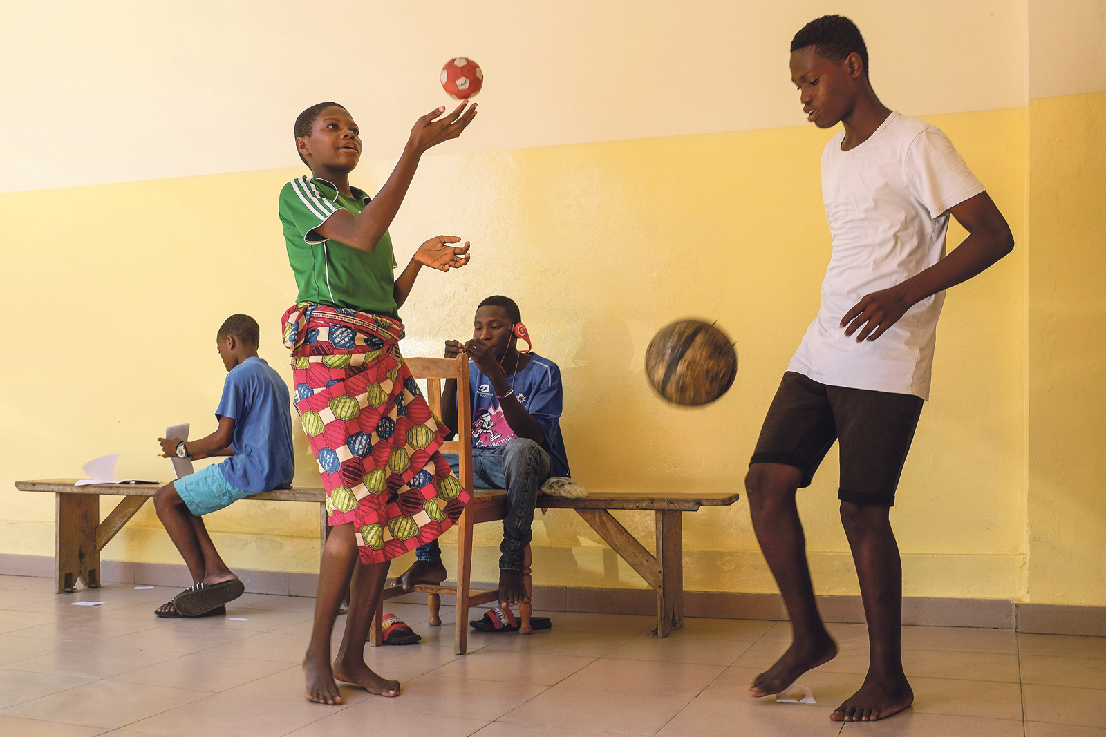 Dans le réfectoire, les enfants vont et viennent. L’horaire du repas est souple, au gré de la faim de chacun, de leurs devoirs respectifs, des répétitions de danse et de chants, nombreuses en prévision de l’inauguration de la Maison du bonheur. Autant d’occasions de se réunir autour d’une activité commune. Friands, les enfants semblent intéressés par toute animation, de l’atelier improvisé d’avions en papier aux exercices de mathématiques proposés par leur camarade Prospa, jeune parrainé particulièrement studieux.