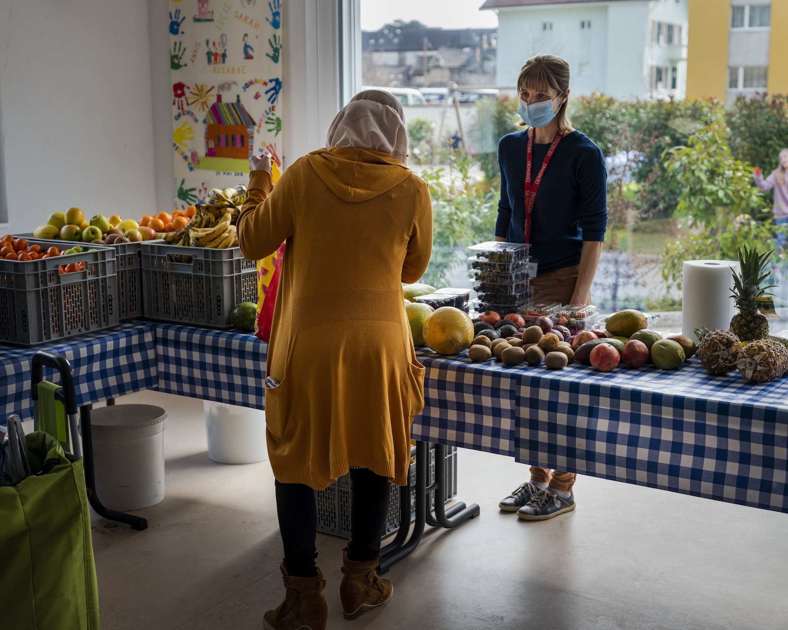 Devant la paroisse, sous un soleil généreux, une file bigarrée de personnes commence à se former, sacs à commissions ou à roulettes à la main. Les langues sont plurielles mais la pauvreté, commune. Aux indigènes se mêlent des Afghans, Syriens, Kurdes… Tous ont reçu, lors de leur dernière venue, un billet mentionnant l’heure à laquelle ils sont attendus. «En raison du Covid-19, nous devons limiter le nombre de présents dans la salle. Par souci d’équité, nous faisons un tournus dans les heures, le choix de provisions étant plus large à l’ouverture de la Table», explique Catherine Gnaegi, précisant encore que les gens ne peuvent pas se servir seuls pour des raisons d’hygiène. Nicole, une bénévole de 79 ans, gère les entrées où trône l’incontournable gel hydroalcoolique. Masquée et protégée par un panneau en plexiglas, elle vérifie la carte délivrée par l’aide sociale que les bénéficiaires sont tenus de présenter. «Ils doivent aussi s’acquitter d’un franc symbolique», souligne cette ancienne enseignante, ajoutant avoir fait du bénévolat toute sa vie. «Je ne peux pas trop porter de marchandises car j’ai mal à l’épaule, mais je ressens le besoin de venir ici. C’est aussi un moyen de me sortir du quotidien. Mon mari souffre du cœur. Quand je ne peux pas participer à la Table, cela me manque.»