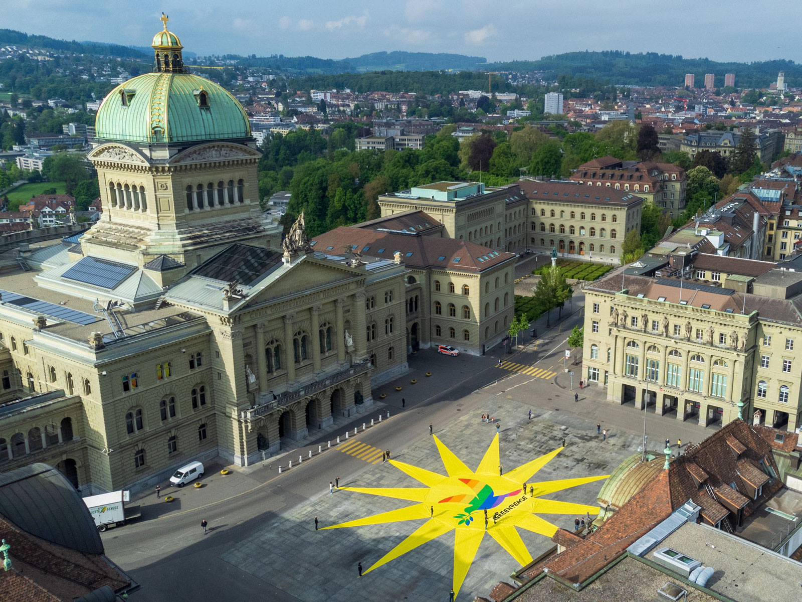 Nouvelle action menée par Greenpeace pour inciter les autorités à développer l’énergie solaire. Le 9 mai dernier, une date choisie en raison, le lendemain, de la séance de la Commission de l’environnement, de l’aménagement du territoire et de l’énergie du Conseil des Etats (CEATE-E), l’organisation écologique a recouvert la place Fédérale d’une immense image d’un soleil orné en son centre d’une colombe, symbole de la paix. Parallèlement, elle a distribué des tracts aux passants. Les militants ont souligné le rôle prépondérant que doit jouer l’énergie solaire dans la réduction des gaz à effet de serre. Une solution permettant de «protéger le climat et de renforcer l’indépendance de la Suisse par rapport aux importations venues d’Etats menant des politiques critiquables». «La guerre en Ukraine doit convaincre les derniers sceptiques que nous devons remplacer immédiatement les énergies fossiles par des mesures d’économies d’énergie et des énergies renouvelables locales», a déclaré dans un communiqué Georg Klingler, expert climat et énergie pour Greenpeace Suisse. L’ONG prône l’essor massif et accéléré du photovoltaïque. «Plus vite la Suisse transformera ses toits en centrales électriques, meilleure sera la sécurité d’approvisionnement... Ainsi de moins en moins d’argent sera versé aux Etats belliqueux ou dévolu à la destruction du climat.» Dans ce contexte, Greenpeace réitère sa demande au Parlement d’augmenter la production du solaire, estimant qu’elle doit passer d’un peu moins de 3 TWh aujourd’hui à 30 TWh par an d’ici à 2035. Cette démarche, pointe les activistes, présente encore l’avantage de n’avoir aucun impact négatif sur la biodiversité. Pour la compléter les jours de grisaille, l’ONG mise sur le recours à l’hydraulique déjà existant. «Nous sommes bien préparés pour un approvisionnement complet avec des énergies renouvelables indigènes. En été, les installations solaires fournissent en outre de l’électricité excédentaire qui permet de produire de l’hydrogène de façon favorable au climat.» Le développement prioritaire du solaire trouve de nombreux partisans: quelque 19000 personnes ont signé une pétition dans ce sens, chiffre Georg Klingler, estimant encore que les partis du camp bourgeois favorables à la relance du nucléaire ou au subventionnement de carburants fossiles vont dans «le sens contraire de l’Histoire».