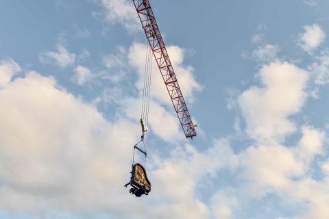 Au début, j’avais un peu peur, le vertige et j’ai dû apprendre à ne pas me fier aux effets d’optique. En montant très vite les premières fois, je croyais m’écraser contre la flèche, tout en sachant qu’il y avait cinq mètres entre le crochet et moi. Mais j’ai entière confiance dans les grutiers qui sont des gens incroyables, d’une sérénité, d’un calme, d’une patience, d’une précision… Pour eux, c’est une première, puisqu’il leur est strictement interdit de transporter des personnes. Me faire balancer est également contraire à leur métier. En tant qu’artiste, je sors du cadre de la Suva, donc je peux me permettre de le faire, appuyé par un volumineux dossier d’ingénieur et dans le respect de la sécurité publique. On applique les normes multipliées par dix. Reste que ça tourne dans tous les sens, au point que je ne peux pas trop regarder ailleurs et que j’ai arrêté de chercher à savoir où je suis, sinon l’estomac en prend un coup. J’essaie de lâcher prise au maximum. C’est la metteuse en scène qui, pendant tout le spectacle, donne des instructions au grutier, avec une marge d’improvisation selon l’avancée du chantier de jour en jour. Car les ouvriers viennent travailler après le spectacle.