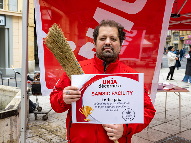 Unia Neuchâtel a remis un «balai d’or» à l’entreprise Samsic Facility, dénonçant entre autres des dépassements hors normes du temps de travail dans l’entreprise.