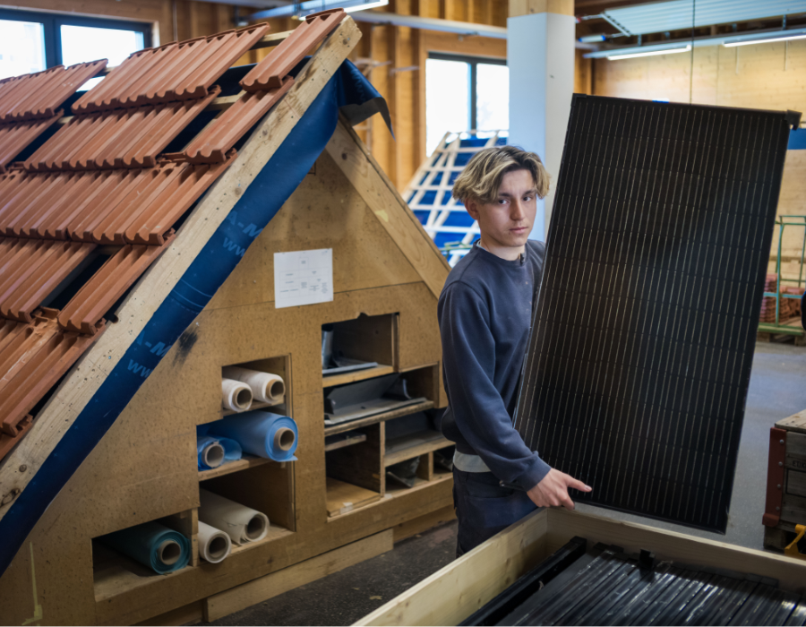 Le soleil brille. C’est de bon augure pour les panneaux solaires qui recouvrent peu à peu les toits du pays. Et même parfois les murs, comme ici à Polybat, centre de formation des apprentis de l’enveloppe du bâtiment. A deux pas, dans une grande halle, des élèves de différents métiers suivent des formations pratiques, dont une petite dizaine de futurs installateurs en panneaux solaires. Ils font partie de la première volée comptant une cinquantaine de jeunes hommes francophones. Du côté suisse-alémanique, ils sont une septantaine à suivre les cours de Polybau, la maison mère, à Uzwil (SG).