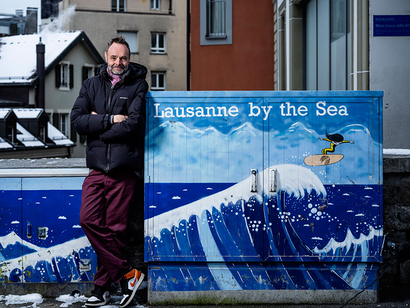 Quarante ans plus tard, après des études artistiques à Bruxelles, l’illustrateur-dessinateur, Pascal Jaquet, s’exprime en tant qu’enseignant d’arts visuels au Centre d’orientation et de formation professionnelle (COFOP). Depuis vingt ans, il transmet sa passion aux élèves, en leur proposant notamment d’embellir les boîtes électriques lausannoises. Ces armoires closes, originellement grises, voire taguées, sont essentielles à l’alimentation électrique de chaque quartier, des ménages aux entreprises. Poétiques ou humoristiques, en lien souvent avec le lieu ou à la suite de l’impulsion d’habitants (l’un d’eux a, par exemple, demandé une peinture de son chien), ces graffitis font sourire le passant et égaient les rues. «C’est un clin d’œil, une forme d’activisme soft. Mettre de la couleur dans la ville, contrebalancer l’envahissement publicitaire et, au fond, nettoyer, car nous recouvrons souvent de mauvais tags», explique celui qu’on appelle aussi Sapin, du fait de sa grande taille.