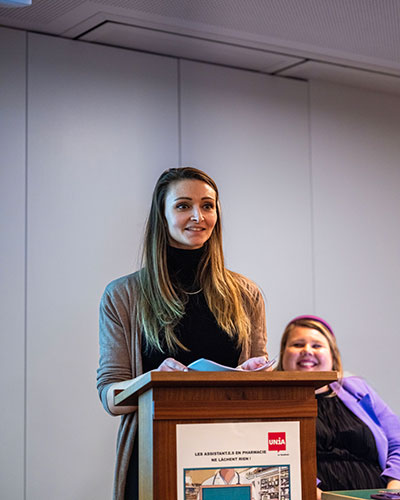 Fanny Hostettler, présidente du comité Unia des assistantes, a ensuite présenté les principales revendications des travailleuses: un salaire minimum de 4300 francs fois 13, une grille salariale évolutive, cinq semaines de vacances pour tous (six dès 50 ans) et l’indexation des rémunérations sur l’inflation. «Nous nous battons pour nous. Pour améliorer notre quotidien. Pour nos collègues et nos familles», a encore expliqué la militante, chaleureusement applaudie par ses collègues comme l’orateur précédent. Secrétaire syndicale d’Unia, Tamara Knezevic a rappelé les principales étapes qui ont jalonné la lutte entamée en 2020. «Nous avons débuté avec une personne. Aujourd’hui, vous êtes plus d’une centaine. C’est incroyable. Historique!» La représentante d’Unia est revenue sur les différents sondages, fédérant jusqu’à 740 participants, qui ont permis de mieux identifier les besoins dans la branche. Avec une constante: la nécessité de revaloriser le métier. Un impératif passant entre autres par de meilleurs salaires. Dans une intervention pleine d’humour, son collègue, Giorgio Mancuso, responsable du secteur tertiaire à Unia Vaud, a commenté le refus des patrons d’entrer en matière sur une CCT. Un refus exprimé par voie de communiqué de presse le 30 novembre dernier. La Société vaudoise de pharmacie (SVPh) a notamment fait valoir l’aboutissement des deux initiatives en faveur du salaire minimum dans le canton pour rejeter l’idée d’un accord dans la branche.
