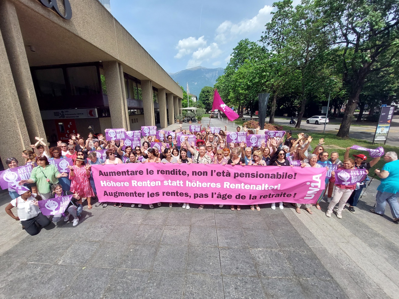 Les femmes d'Unia derrière une banderole s'opposant à AVS21.