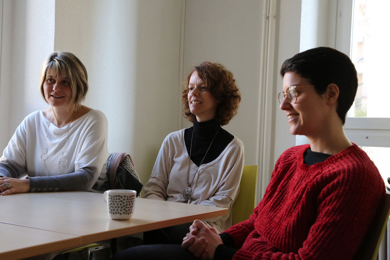 Sylvie Dupraz, Sandrine Rollinet et Cinzia Sigg assises autour d'une table.