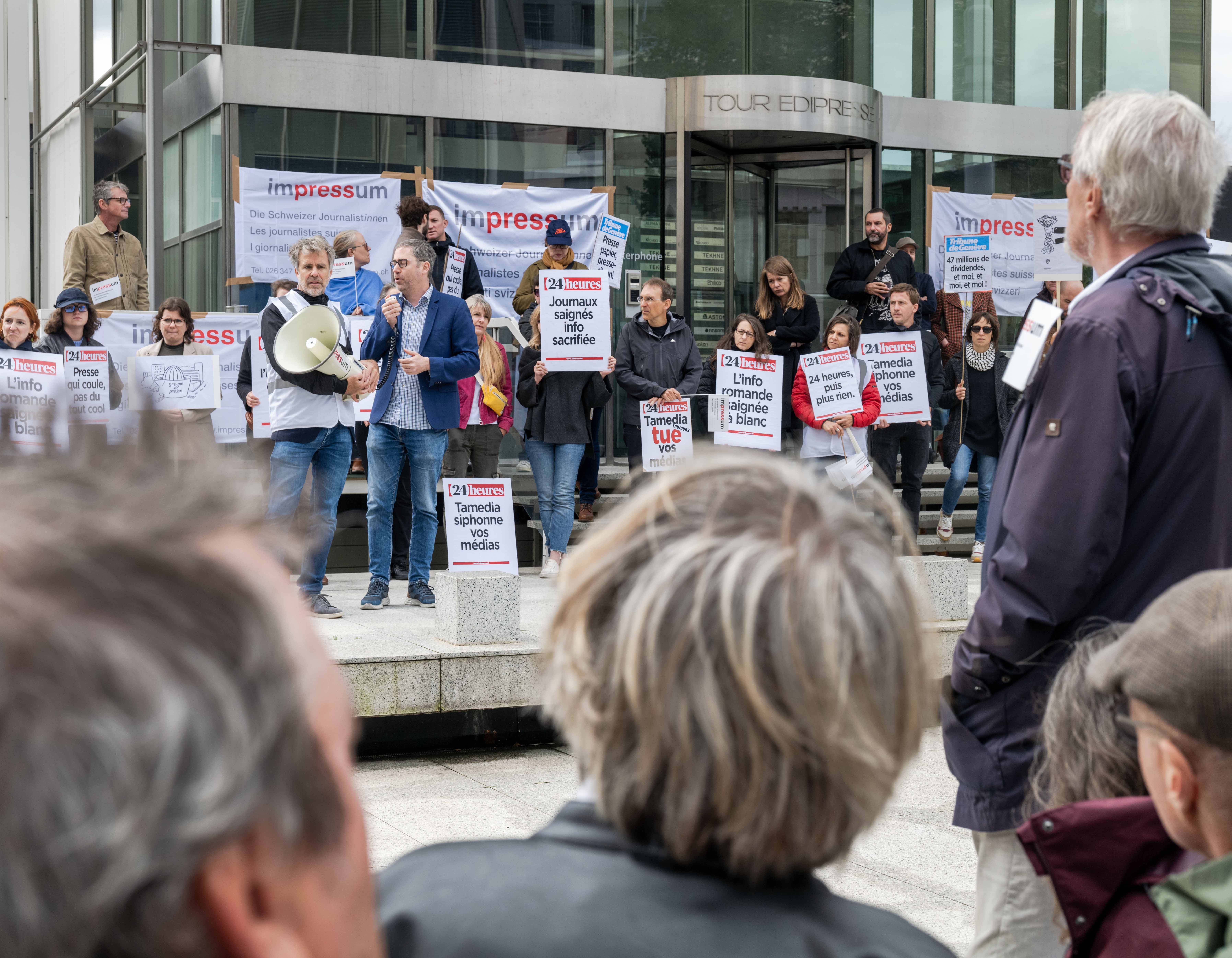 Des représentants de plusieurs syndicats – dont Arnaud Bouverat, secrétaire régional d’Unia Vaud – sont venus apporter leur soutien aux employés romands de Tamedia, les appelant à lutter collectivement et solidairement contre cette restructuration.