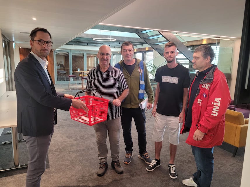La délégation a remis symboliquement un panier au directeur de la section genevoise de la Société suisse des entrepreneurs: «Combien êtes-vous prêt à mettre dans notre panier cette année?»
