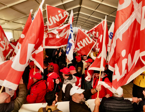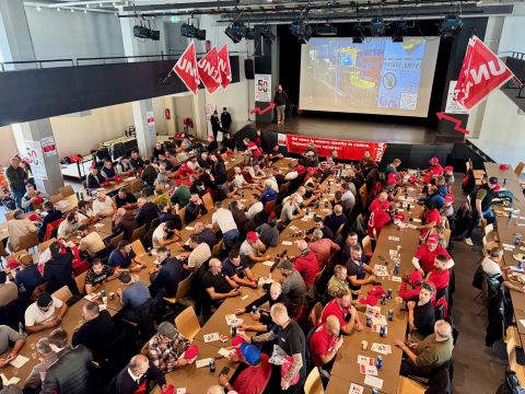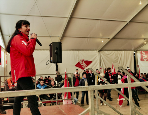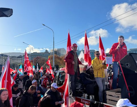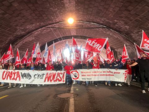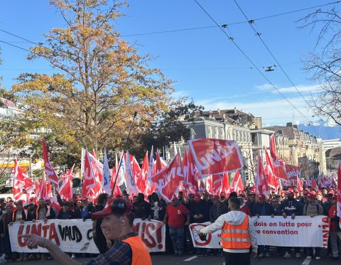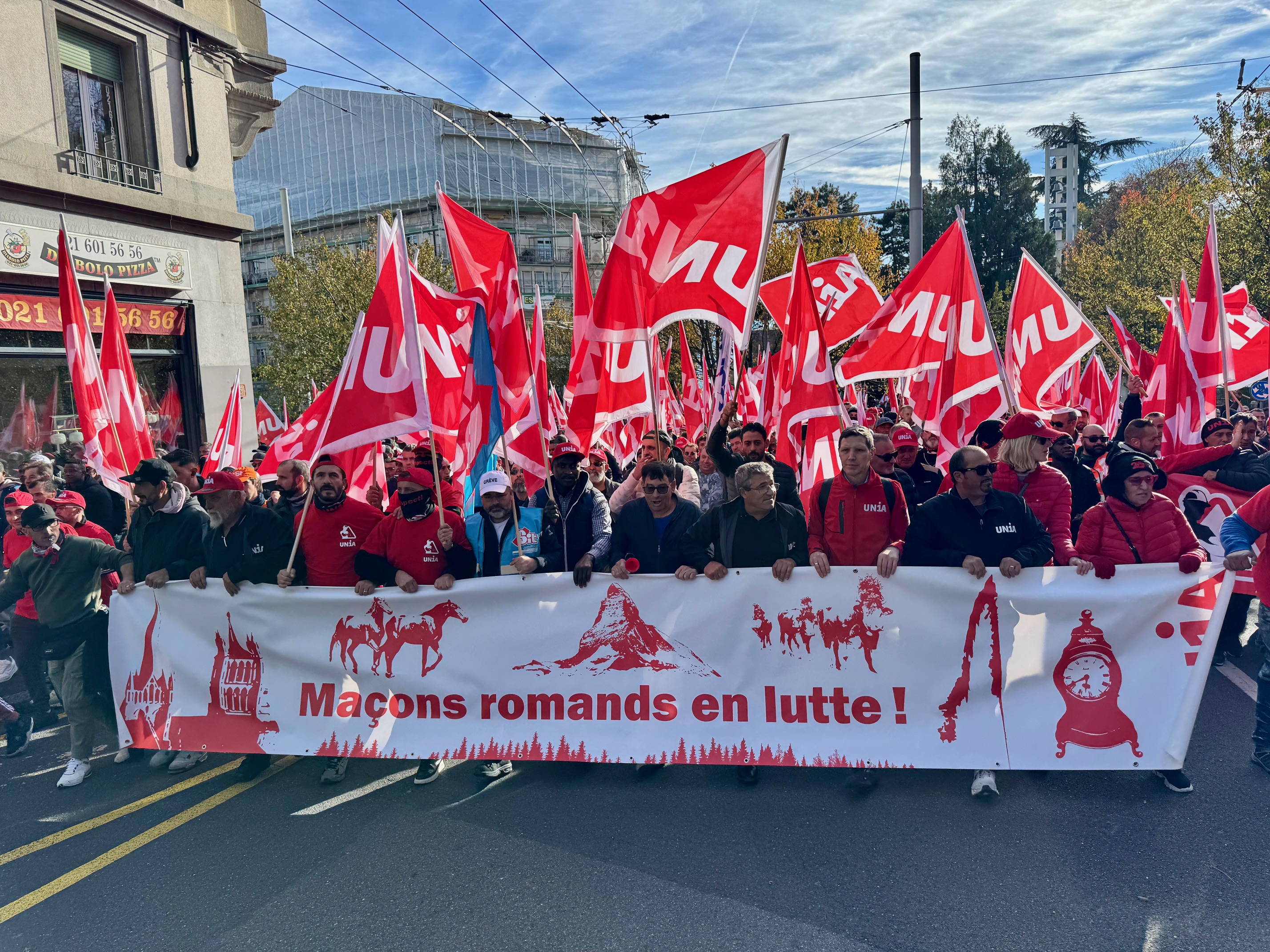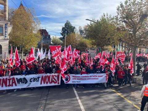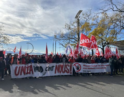 Depuis le début de la matinée, ce mardi 4 novembre, les maçons venus de toute la Suisse romande convergent vers Ouchy, à Lausanne, où Pierre-Yves Maillard, président de l’Union syndicale suisse prend la parole devant une assemblée surchauffée. «Vous montrez l'exemple parce que vous vous battez, lance‐t-il. Votre mobilisation payera.» Vania Alleva, présidente d’Unia, lui succède. «Votre lutte est juste! Vos revendications sont justes. Ensemble, nous sommes forts.»