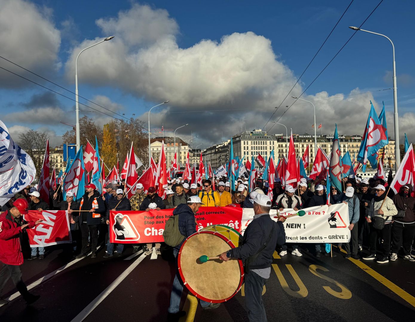 A Genève, près de 2600 grévistes selon Unia se réunissent lundi en début de matinée à la place Lise-Girardin, près de la gare Cornavin. Le cortège s'ébranle vers 9h au son des tambours, en direction des rues de Chantepoulet et du Mont-Blanc (voir photo ci-dessous). Nico Lutz, membre du comité directeur d'Unia, en charge de la construction, figure au premier rang des manifestants. La manifestation s'arrête pendant une demi-heure sur le pont du Mont-Blanc pour des prises de parole. Nico Lutz rappelle que les maçons exercent un métier dangereux, avec une personne sur six qui a un accident de travail chaque année. Une minute de silence est effectuée, en hommage à ceux qui ont perdu la vie en 2025 sur les chantiers. La manifestation s'achève vers 13h à la promenade de Saint-Jean.