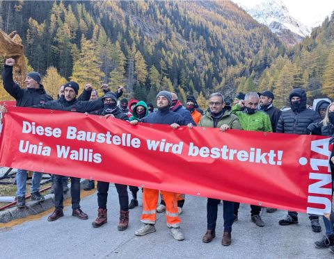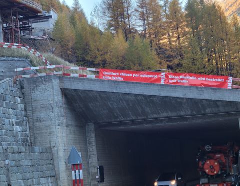 Dans le Haut-Valais, les travailleurs bloquent le chantier d'assainissement de la route du Simplon, une action qui se poursuivra tout au long de la matinée (voir galerie ci-dessous).