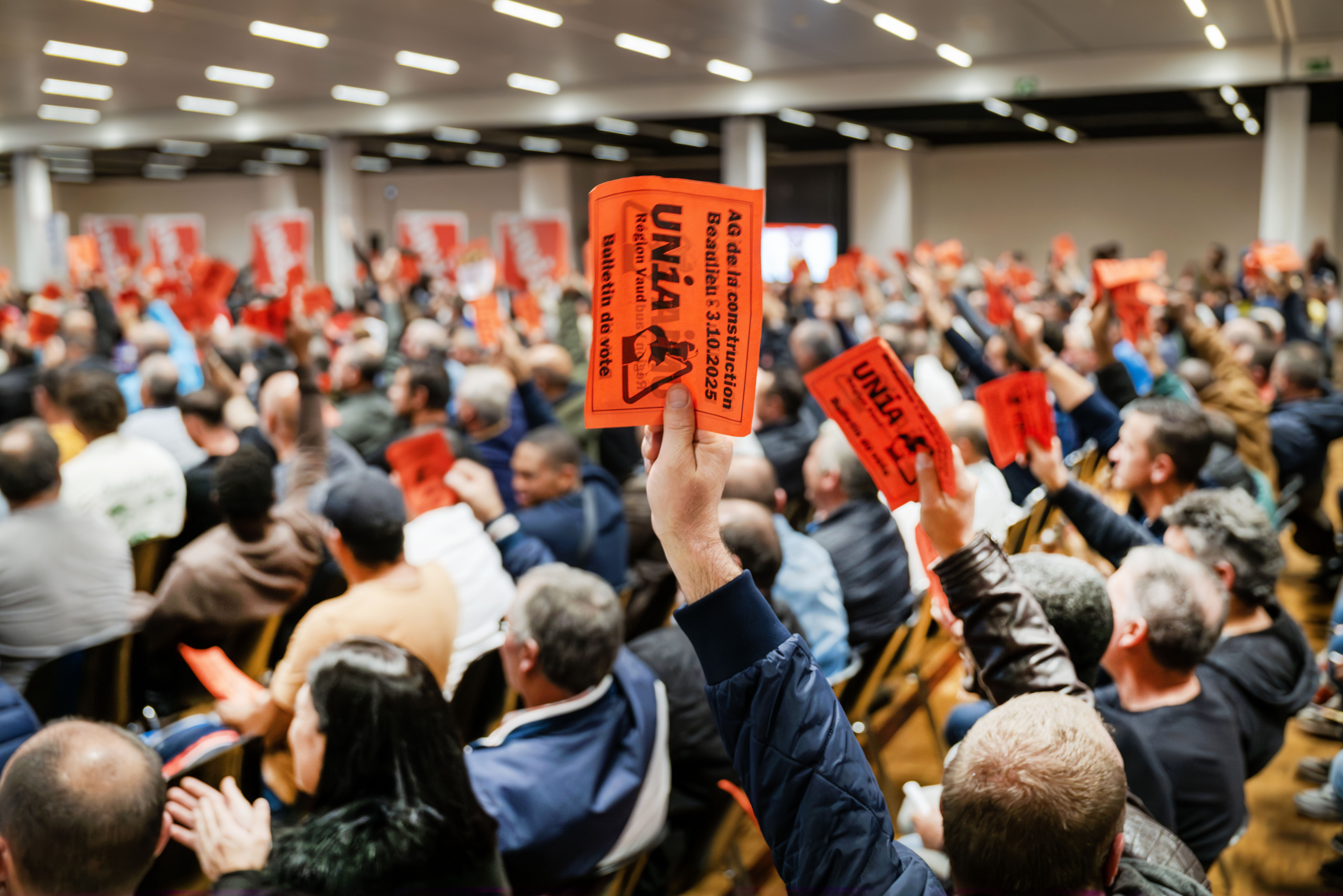 C’est une marée de bulletins rouges qui s’est élevée avec force acclamations, dans le centre des congrès du Palais de Beaulieu, pour approuver le principe d’une grève nationale en novembre. Près de 900 maçons vaudois ont participé ce vendredi 3 octobre à l’assemblée générale de la construction organisée par Unia Vaud à Lausanne. A l’instar de leurs confrères d’autres cantons, ils lancent ainsi un ultimatum aux patrons: si ces derniers s’obstinent à refuser les revendications des syndicats pour le renouvellement de la Convention nationale de la branche, qui concerne environ 80 000 travailleurs dans tout le pays, ils poseront la truelle les 3 et 4 novembre.