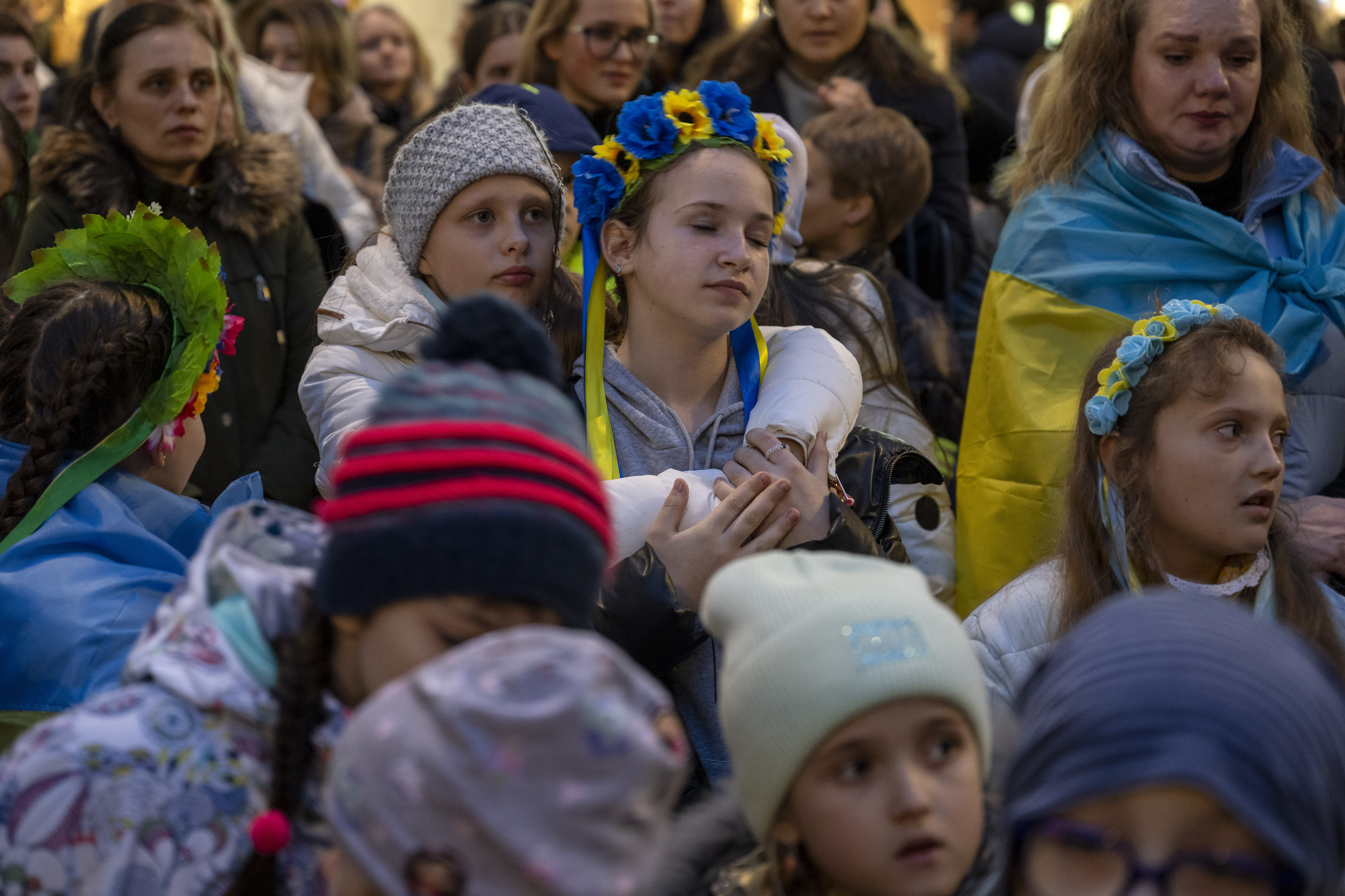 Des enfants tiennent des pancartes; un adolescent arbore la photo de son père disparu, avec cet appel déchirant: «Russia, where is my dad?»; une petite fille tient un dessin avec un drapeau ukrainien, une colombe et ces mots: «Avec un rêve dans le cœur pour la paix en Ukraine.» Une femme prend le micro et appelle au souvenir de ce premier jour de guerre, de la survie, des adieux: «Pas une seule famille ne pleure un être cher. Ce n’est pas un simple conflit, mais une guerre brutale, un combat pour un monde libre… La Russie est l’agresseur, Poutine un criminel de guerre.»