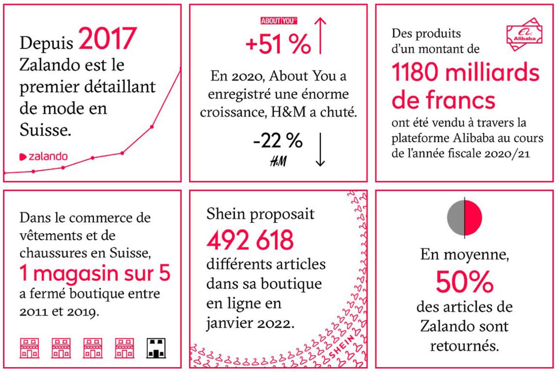 La révolution numérique a changé les rapports de force dans le capitalisme de la mode. La pandémie de coronavirus a accéléré cette tendance. Aujourd’hui en Suisse, trois vêtements sur dix sont déjà achetés sur Internet – en 2016, cette manière de consommer ne représentait encore que 16% des chaussures et des vêtements vendus.