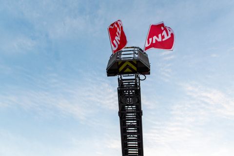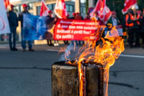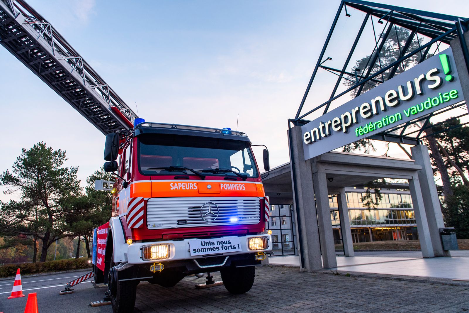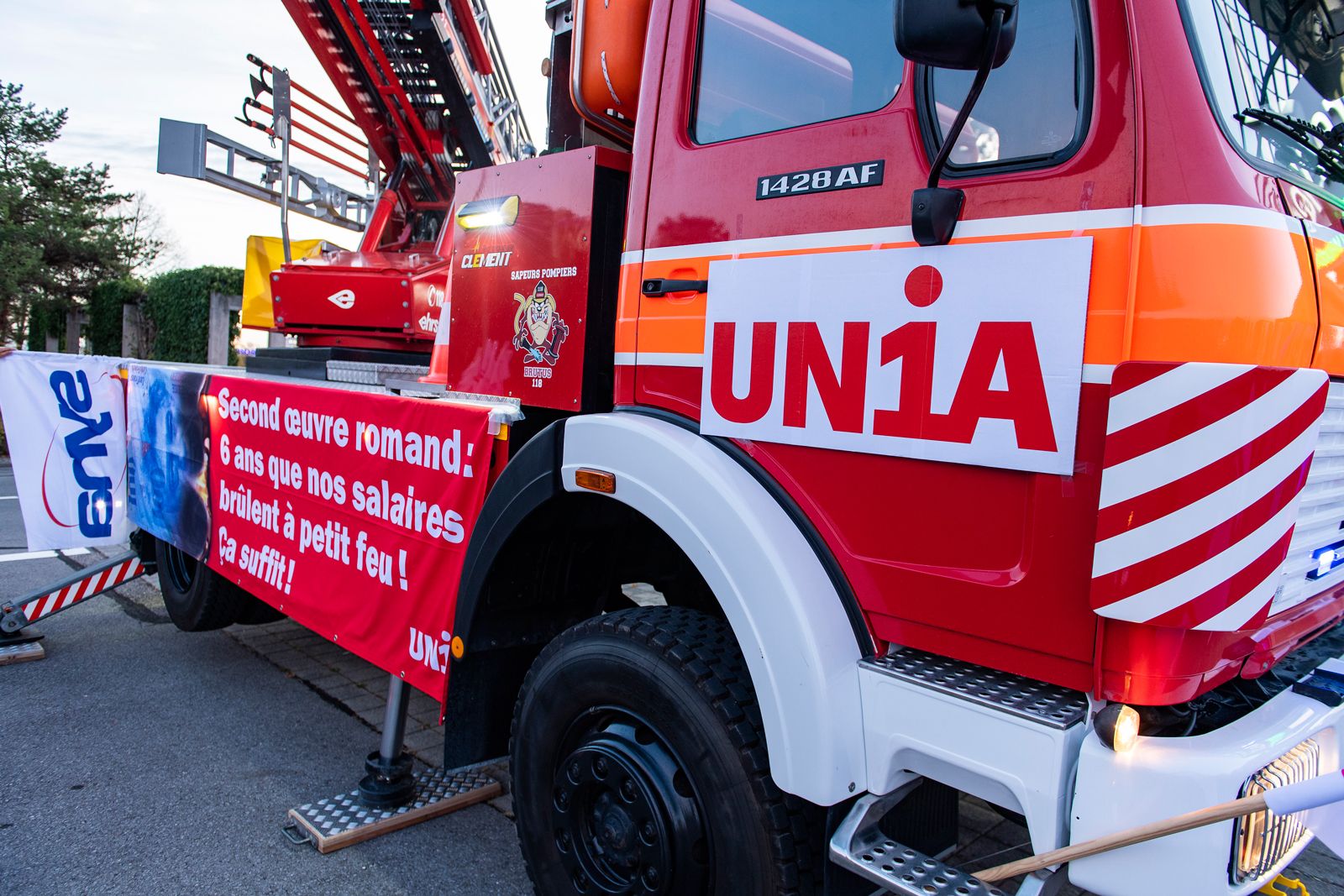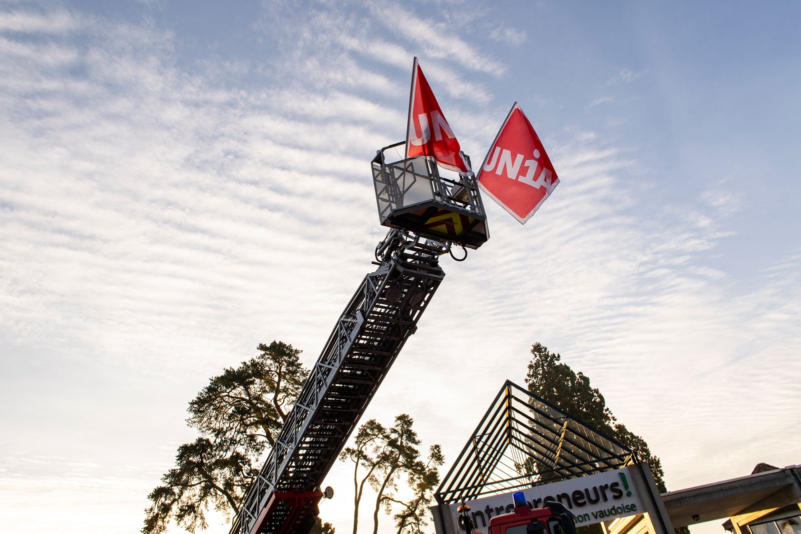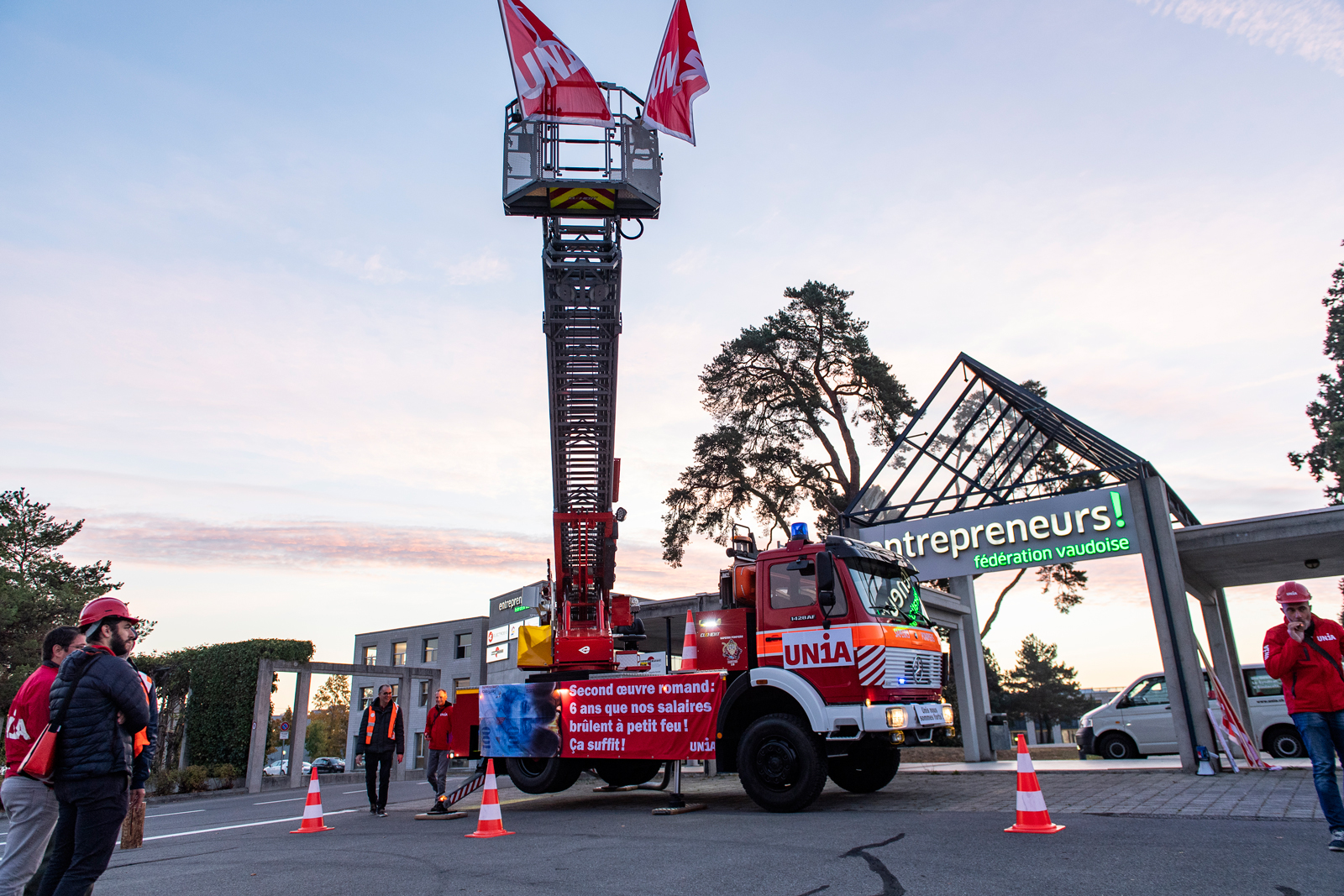Vendredi 12 octobre, un peu avant 9h, alors que le premier round de négociations salariales entre les partenaires sociaux devait s'ouvrir à Tolochenaz, un camion de pompiers aux couleurs du syndicat Unia a fait son entrée pour accueillir les délégués patronaux, demandant symboliquement l’extinction de l’incendie qui touche les salaires de la branche. Posté devant la Fédération des entrepreneurs, l'engin, toute échelle déployée, arborait fièrement une banderole: «Second œuvre romand: 6 ans que nos salaires brûlent à petit feu! Ça suffit!»