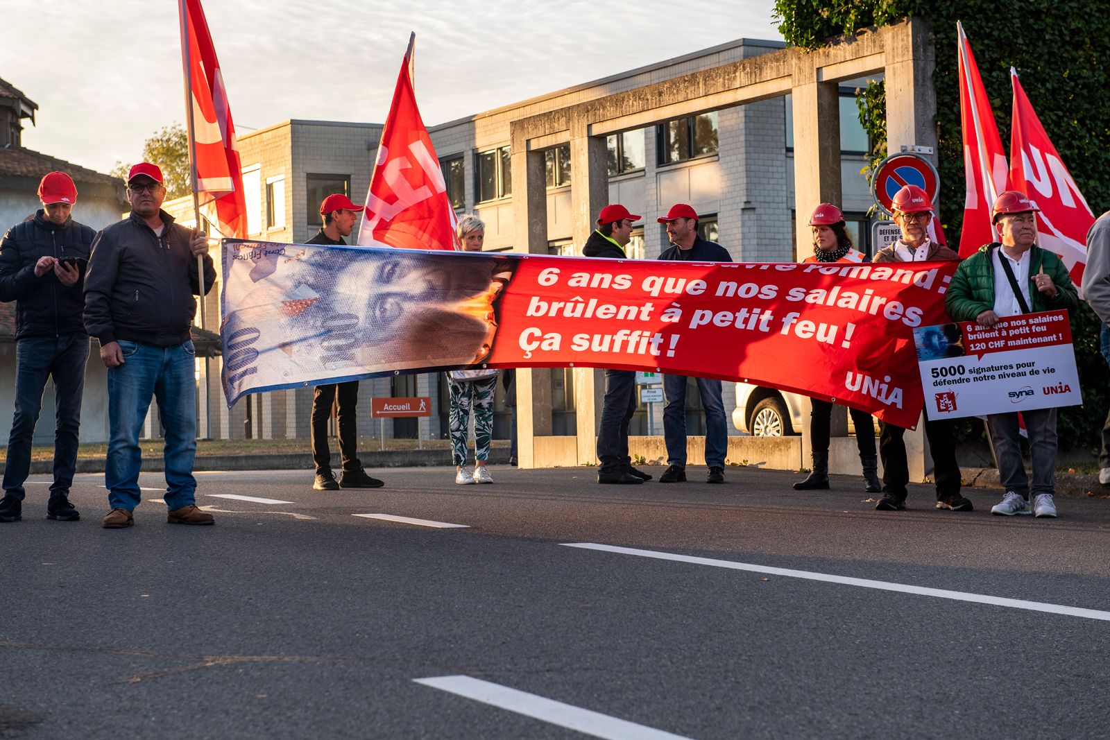 «Cette action avait pour but de sensibiliser les employeurs et le grand public à l'urgence d'augmenter les salaires dans cette branche», souligne Aldo Ferrari, vice-président d’Unia et responsable du secteur Arts et métiers. La quarantaine de travailleurs du secteur présents a porté un message clair: qu'ils soient plâtriers, peintres, menuisiers, charpentiers, etc., ils exigent une augmentation de salaire de 120 francs à partir de 2019. Pour renforcer leur demande, une pétition munie de 5000 signatures récoltées sur les chantiers de toute la Suisse romande a été remise aux représentants patronaux de la FRECEM et de la FREPP, les deux principales associations patronales du second œuvre romand.