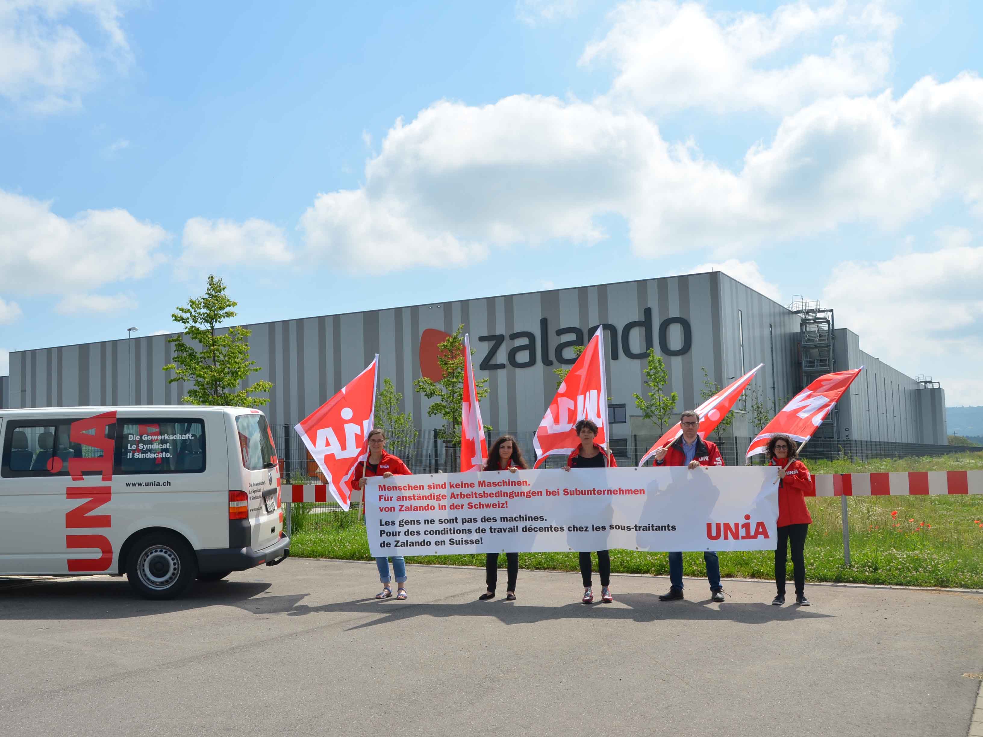«Les gens ne sont pas des machines. Pour des conditions de travail décentes chez les sous-traitants de Zalando en Suisse!» Une délégation d’Unia s’est rendue le 31 mai au centre logistique de Zalando à Lahr, en Allemagne, pour dénoncer les conditions de travail en vigueur chez ses sous-traitants suisses chargés de s’occuper des renvois, à savoir les entreprises MS-Direct et Ingram Micro en Suisse alémanique. Faute d’adresse en Suisse, le syndicat a fait le déplacement chez nos voisins. Il a également adressé à la direction du géant du commerce en ligne à Berlin une pétition munie de plus de 2000 signatures exigeant des conditions de travail correctes ainsi que des salaires minimums décents pour ces salariés.