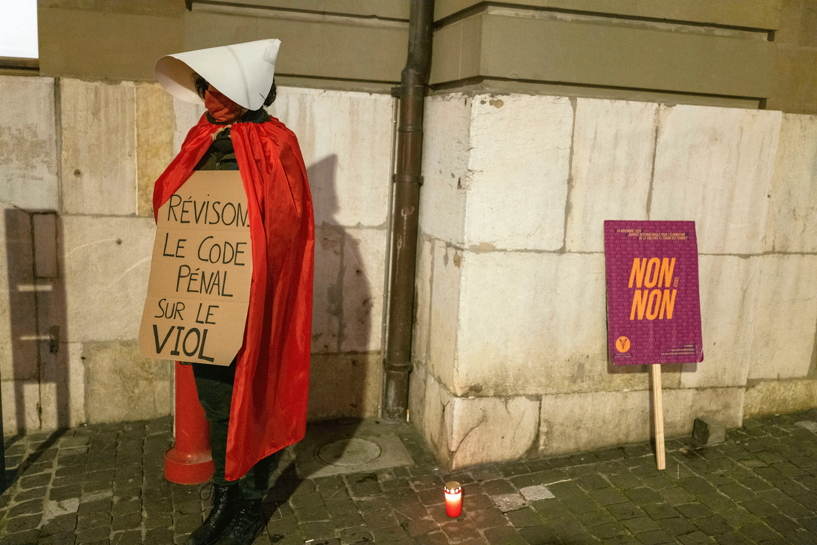 A Genève, le 25 novembre, devant le Palais de justice, plusieurs «servantes écarlates», symboles de l’oppression des femmes, ont demandé que l’absence de consentement soit un élément décisif du viol.