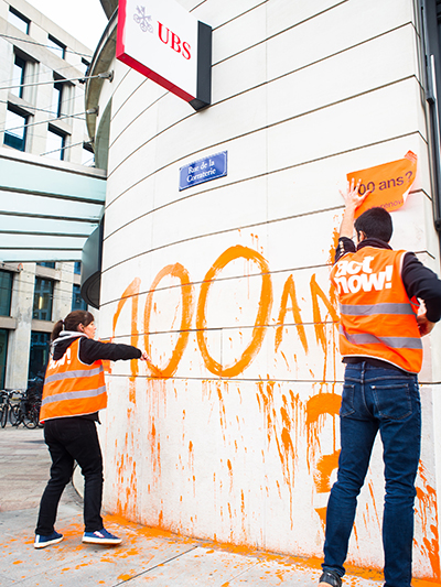 Le matin de l’action, Prune n’imagine pas qu’elle sera arrêtée si longtemps. Sur la façade de la banque, avec son camarade Anthony, elle écrit «100 ans?» avec une peinture orange lavable. Puis, tous deux s’assoient en tailleur devant l’établissement. Les badauds s’arrêtent, les prennent en photo, expriment leur irritation ou les encouragent. Après un certain temps, la police arrive, entoure le secteur d’un ruban de signalisation. Prune raconte: «L’un des policiers nous demande: “Vous croyez vraiment pouvoir encore changer quelque chose?” Ils sont très calmes, presque impassibles, nous disent que nous n’avons pas d’autorisation de manifester. Anthony leur répond que le droit international prévaut.»