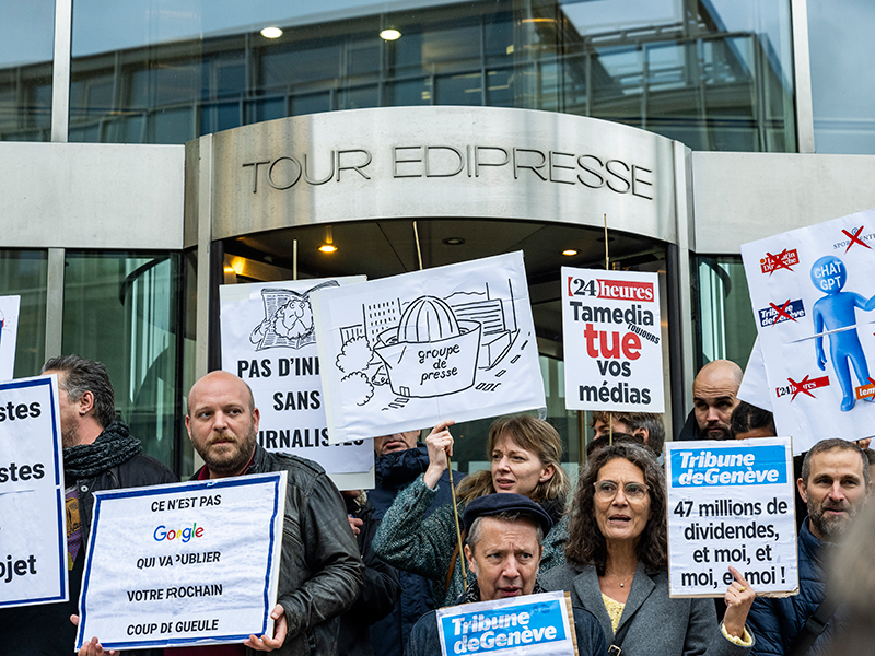 Quelque 500 collaborateurs de TX Group ont manifesté le 31 octobre à l’annonce d’une nouvelle coupe dans les effectifs de l’entreprise de médias. Près de 200 employés romands ont débrayé et ont défilé de la gare de Lausanne à la Tour Edipresse de Lausanne (photo). Au même moment, à Zurich, environ 300 salariés ont manifesté devant le siège social du groupe. En septembre, la suppression de 48 postes avait été annoncée dans les titres payants du groupe, tels que 24 heures, la Tribune de Genève et Le Matin dimanche. Un mois plus tard, c’est 35 emplois qui passent à la trappe à 20 Minutes, ainsi qu’aux rédactions du Sport-Center et du site de lematin.ch. Avec les freelances, dont le contrat est résilié, c’est plus de cent emplois qui sont biffés. «Nous savons faire des efforts pour sauver nos titres. Mais la page qui se tourne aujourd’hui nous précipite vers un véritable grounding de la presse romande qu’il faut à tout prix empêcher. C’est notre responsabilité à tous», a déclaré le président de la Société des collaborateurs de 24 heures, Erwan le Bec, à Lausanne. Présent au rassemblement, le secrétaire général de la Fédération internationale des journalistes, Anthony Bellanger, a fait remarquer, pour sa part, que «quand on distribue 47 millions à ses actionnaires, on n’a pas le droit de licencier». L’association professionnelle Impressum «appelle à la solidarité pour faire face à cette attaque», tandis que Syndicom «exige un arrêt immédiat des licenciements».