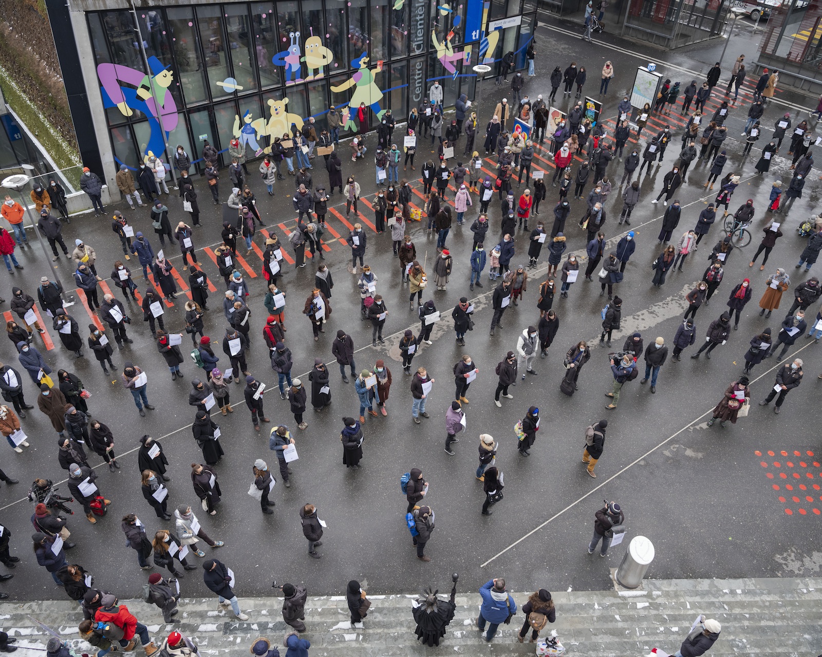 Nous avons, avec plusieurs autres organisations, mené une action coordonnée dans dix villes de Suisse romande pour alerter les autorités et l’opinion publique sur la nécessité d’agir rapidement pour soutenir le milieu culturel. Cette mobilisation a commencé le 13 février et durera jusqu’au 25 février, date du premier cas de Covid-19 en Suisse en 2020. Lors de l’action de samedi passé, nous étions habillés en noir et avons lu une lettre ouverte adressée à la Confédération et aux autorités cantonales pour exposer notre situation et réclamer de l’aide. Nous avons ensuite observé une dizaine de minutes de silence – pour dénoncer un Etat sourd à nos requêtes – avant de faire du tapage...