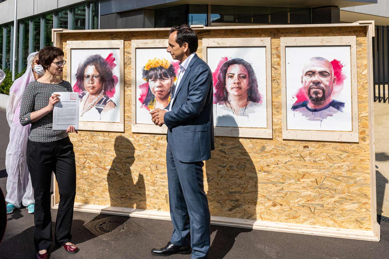 Jeudi dernier à Bâle, Public Eye a remis à Roman Mazzotta, directeur de Syngenta Suisse, une pétition contresignée par près de 38000 personnes, devant des portraits de militants brésiliens peints avec de l’eau contaminée aux pesticides… Les signataires demandent à la multinationale de cesser la production et la vente des produits extrêmement dangereux, comme l’atrazine, le glyphosate et le paraquat. Substances faisant des ravages sanitaires et environnementaux dans les pays où elles sont largement utilisées. Comme au Brésil où une enquête de Public Eye a montré que des millions de personnes y sont exposées, avec des risques énormes en matière de cancer, de malformations congénitales, de maladie de Parkinson et d’autres affections. Une situation qui concerne également tous les autres pays consommateurs de ces substances toxiques. En Suisse, bien que certains produits ne soient plus commercialisés, des résidus de pesticides se trouvent dans l’eau potable, notamment l’atrazine, perturbateur endocrinien interdit dans nos frontières depuis 2007. Public Eye a aussi rappelé le rôle central joué par Syngenta dans la vente de ces pesticides hautement toxiques. Et indiqué qu’en 2017, le géant bâlois avait réalisé un chiffre d’affaires d’environ 3,9 milliards de dollars grâce à ces substances.