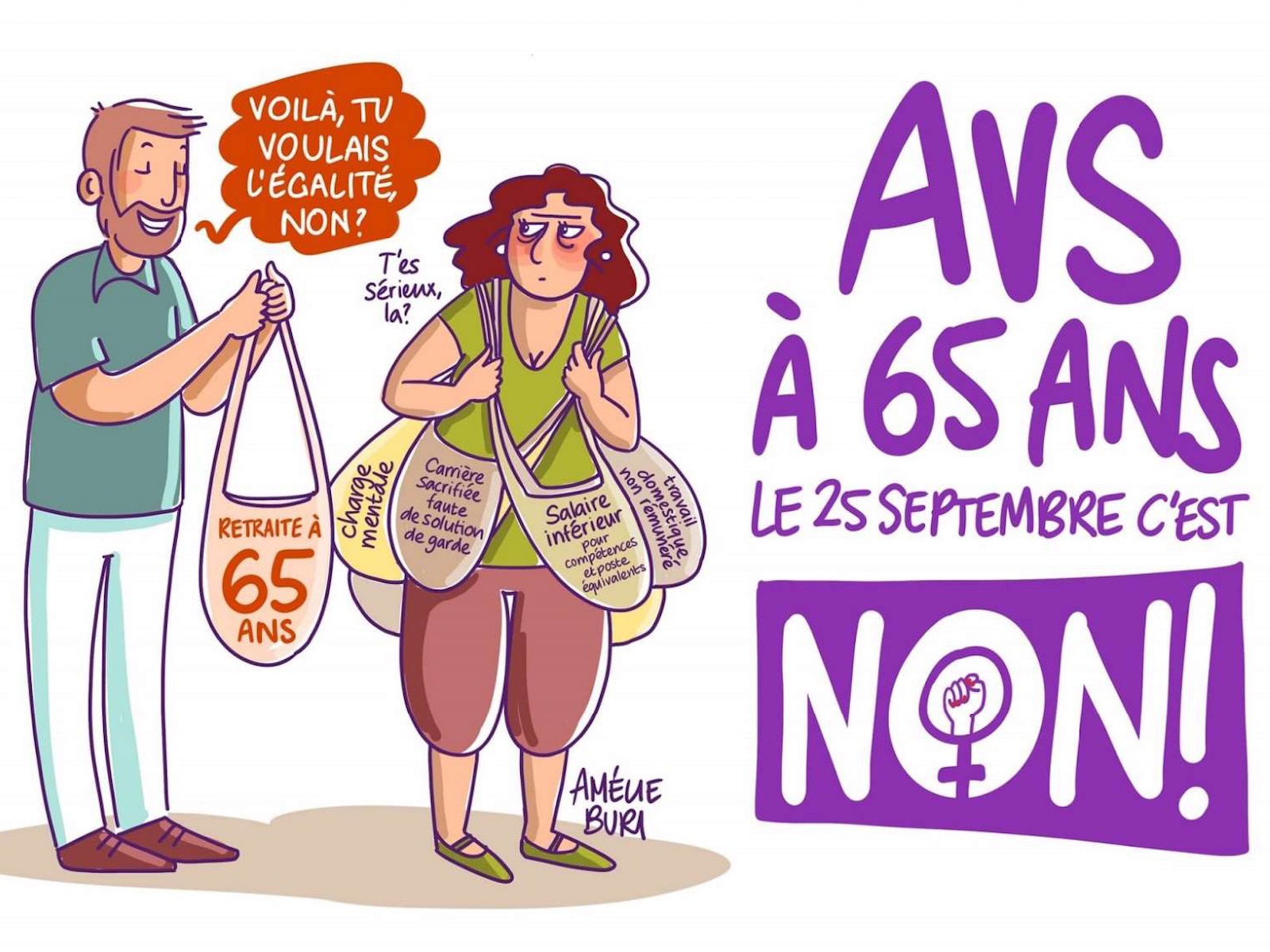 Une femme porte plein de sacs. Son mari lui en tend un autre sur lequel on peut lire "Retraite à 65 ans". Il lui dit: Voilà, tu voulais l'égalité non?