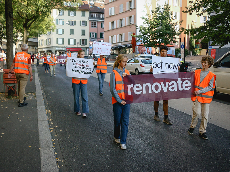 Isaure, 14 ans, est imperturbable. Elle marche pour la première fois avec Renovate Switzerland. Sa première manifestation, c’était il y a à peine une semaine à Berne, lors de la marche pour le climat organisée par l’Alliance climatique. «Je marche aujourd’hui, parce que ça me touche comment va le monde.» A quelques pas, Anthony, 20 ans, étudiant en relations internationales, participe à sa dix-neuvième action depuis ce printemps. «Les mouvements de résistance civile ont été nécessaires pour les droits des personnes noires ou ceux des femmes. Aujourd’hui, la rénovation thermique permettrait de diminuer de 25% nos émissions directes de gaz à effet de serre. Notre demande est simple et consensuelle, car elle crée des emplois et permet une indépendance énergétique de la Suisse. Nous ne sommes juste pas d’accord sur la vitesse. Il y a urgence!»