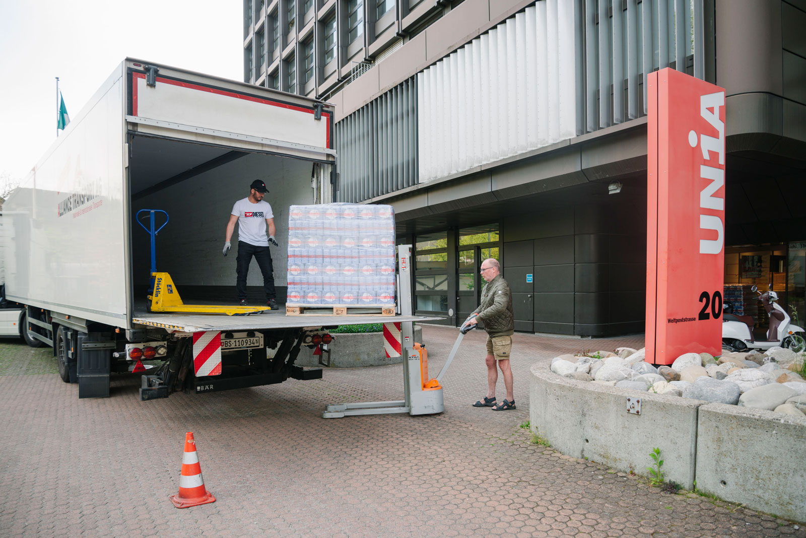Camion en chargement devant la centrale d'Unia.