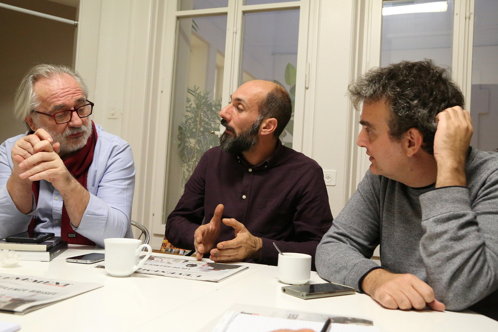 Rencontrés à la mi-novembre à Berne, Giorgos Chondros, membre du comité central de Syriza, George Pallis, pharmacien et député au Parlement grec, et Panos Papadopoulos, chef du cabinet du Ministère de la santé (de g. à dr.) ont présenté les enjeux de l’affaire Novartis secouant leur pays. L’enquête pour corruption est toujours en cours. De nombreuses personnes sont concernées, dont deux anciens Premiers ministres et huit ex-ministres.